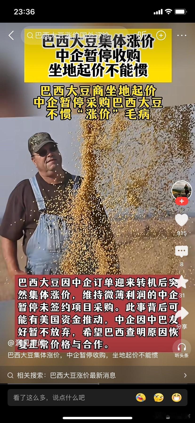 巴西大豆集体涨价? 有些国家是想不明白,前面不是有国家已经打了样了吗?就不知道后果? 所谓的没有一巴掌是白挨的,有点资本和筹码就开始跳脚,想拿捏东大 前有波兰封闭边境,荷兰抢半导体公司,哪个也特得到他们期望的结果?只有合作才能真正实现互利互惠。