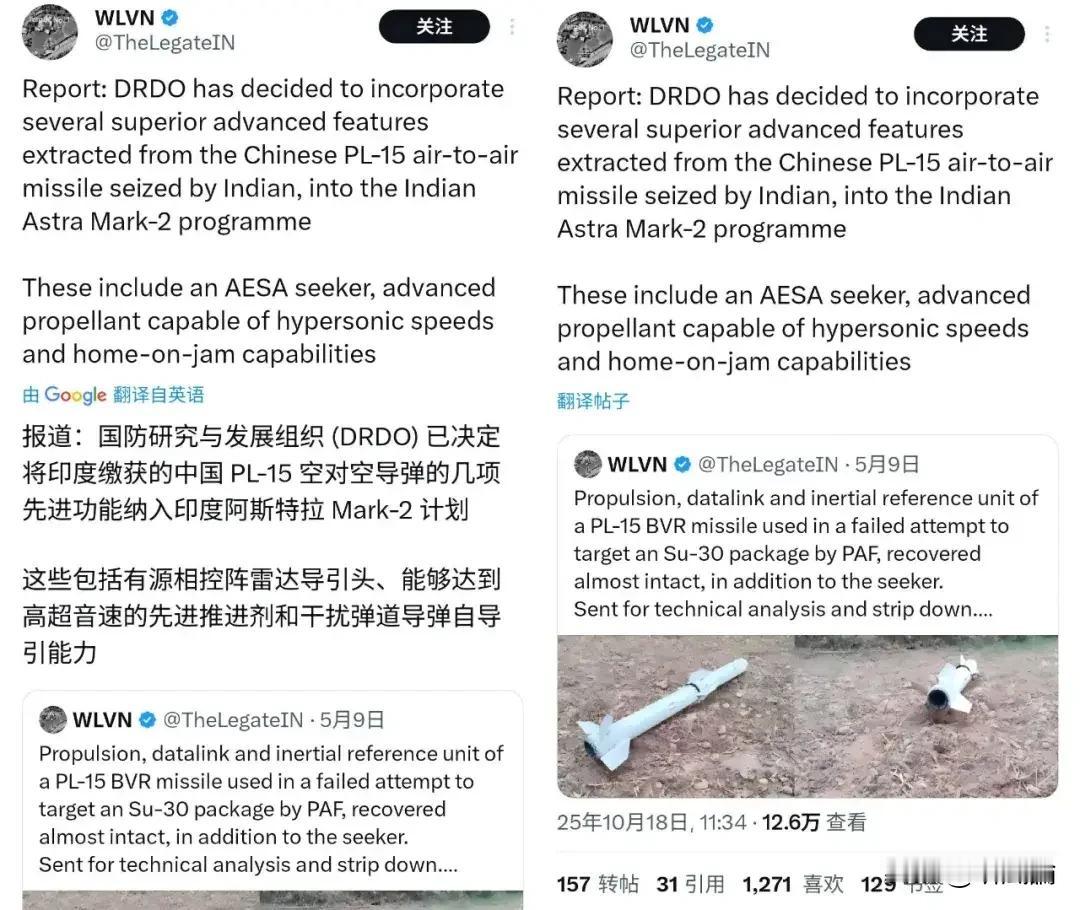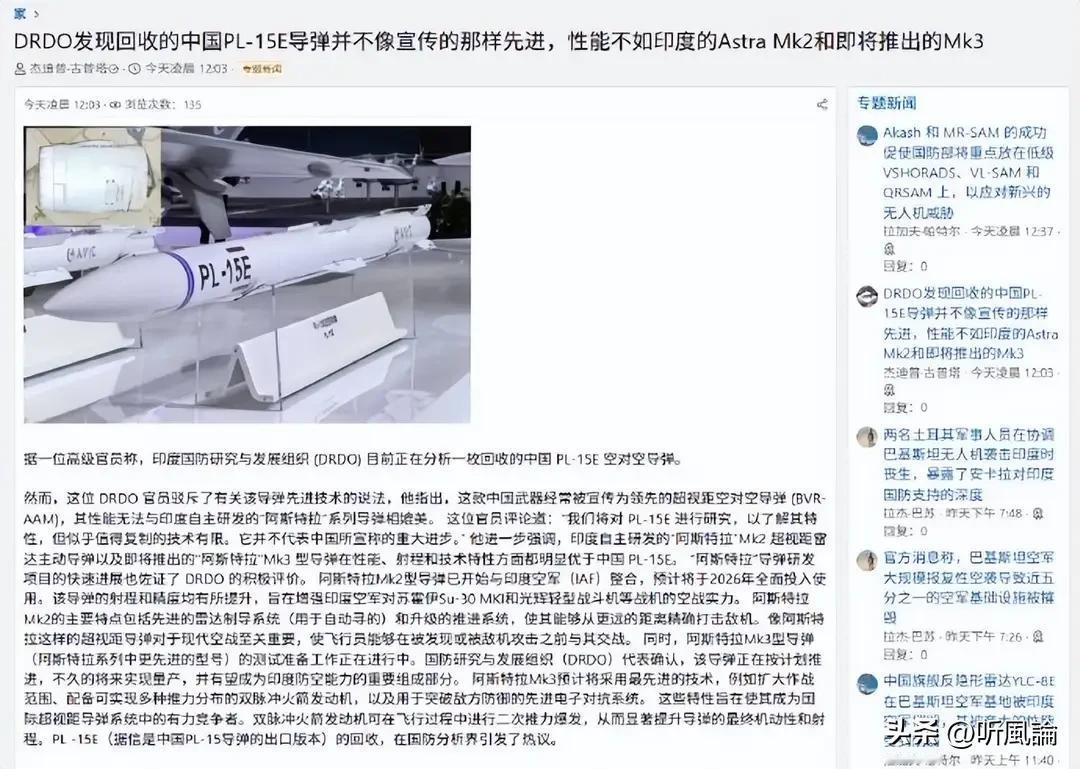 印度捡了咱的导弹想仿制?怕是白忙活! 印度媒体这几天吵吵嚷嚷,说他们捡了中国的霹雳-15E导弹残骸,打算仿制里头技术。据《印度斯坦时报》和《欧亚时报》讲,今年5月印巴空战时,一枚巴基斯坦发射的霹雳-15E掉在印度旁遮普邦,没炸开。印度军方赶紧拉去海得拉巴的DRDO实验室拆开研究,想学三项技术:雷达头、推进燃料和抗干扰算法,用在自家“阿斯特拉Mk-2”导弹上。 可这枚导弹是出口版,跟中国自用的差得远。出口版的雷达是2015年左右的老型号,比咱解放军现役的落后一代半。印度就算把零件摸透,也仿不出核心门道。 为啥印度这么上心?因为霹雳-15确实厉害。它射程200公里,雷达头能抗干扰,发动机快到头了还能再加速。5月空战时,印度苏-30MKI和阵风战机还没凑近,就被歼-10C挂着这导弹打得没脾气。 但仿制不是扒零件就能成。霹雳-15的雷达头里头有毫米波芯片、复合材料罩子,印度连自家雷达都造不利索,更别说缩小了塞进弹头。推进剂配方他们也搞不转。历史上没几个国家真靠捡破烂仿出先进导弹,印度工业底子薄,东西攒不齐,学个样子也白搭。 其实咱出口型号早就留了后手。关键算法加密了,部件也是降级的,印度拆了也破译不了。再说中国新技术又更新了,他们撵不上。印度这么闹,也就是面子上挂不住,想讨个心理平衡。真指望靠捡个残骸翻身?门都没有!印度导弹技术 印度导弹 印度获霹雳导弹 印度空空导弹 PL15E导弹 霹雳15导弹 霹雳一15导弹