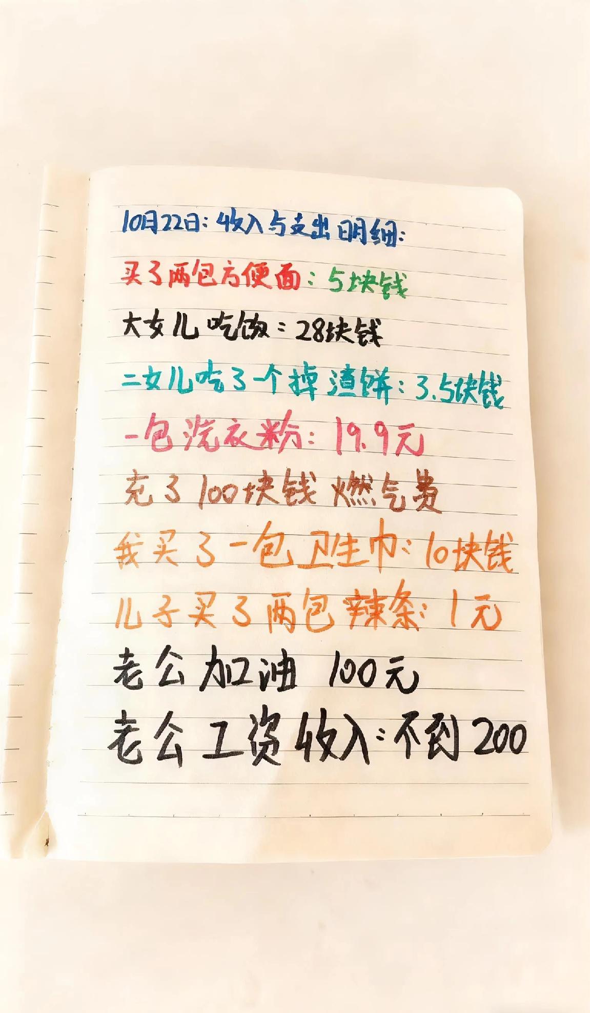 这日子过得心慌慌!说实话,从来没有算过每天花多少钱,刚刚我细算了一下昨天的支出和收入,感觉这日子没有盼头了。 10月22日我家花出去267.4块钱,收入还不到200! 两包方便面5块钱,一个掉渣饼3.5元,一包洗衣粉19.9元,两包辣条1块钱,一包卫生巾10块钱,大女儿吃饭28块钱, 老公在下班途中加了100块钱的油,回来又给燃气充了100元。老公挣了不到200! 这些算下来还搭进去老本67.4块钱! 本来这个辣条和方便面,还有掉渣饼不该买的,但是儿子哭着要吃辣条,女儿哭着要吃方便面和掉渣饼,不买就在地上打滚,没办法最后买了。 燃气费,洗衣粉和卫生巾,是我必须买的。 大女儿上高中一年级了,在学校里吃住,这个28块钱是必须花的。 家离公司比较远,早晨上班又比较早,所以老公这100块钱油也是必须要加的。 好在没有房贷车贷,好在上个月公婆给了2万我存起来了,这样我的心里还好受一些。