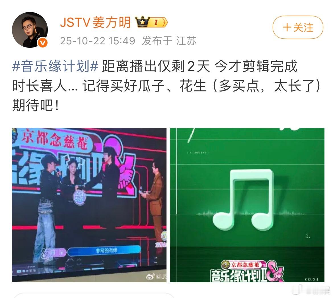 《音乐缘计划2》你大事很妙啊!昨天总导演发微博表示才剪辑完成,有细心的网友仔细一看发现首期时长竟然快三个小时,这时长真的太让人满足了吧~