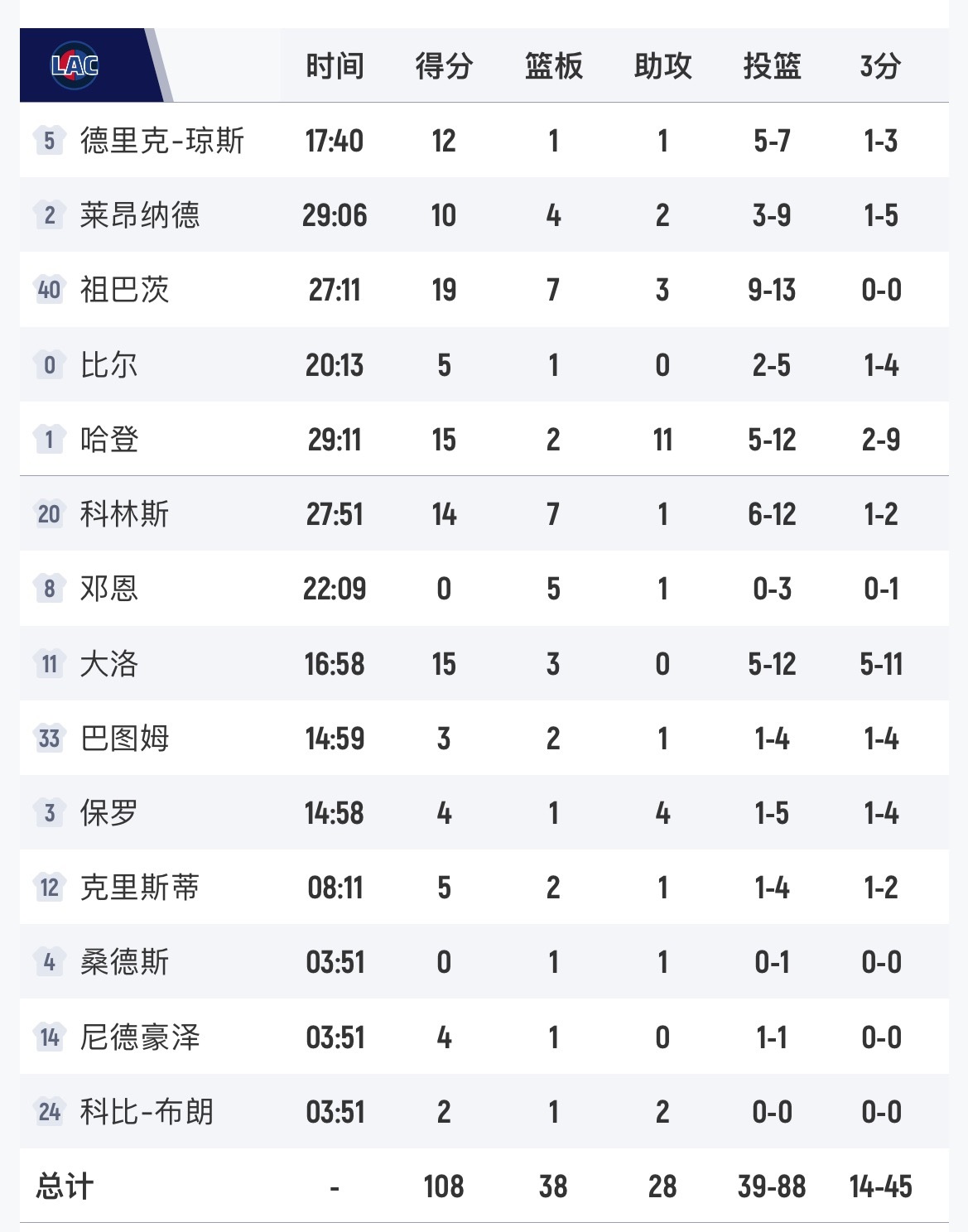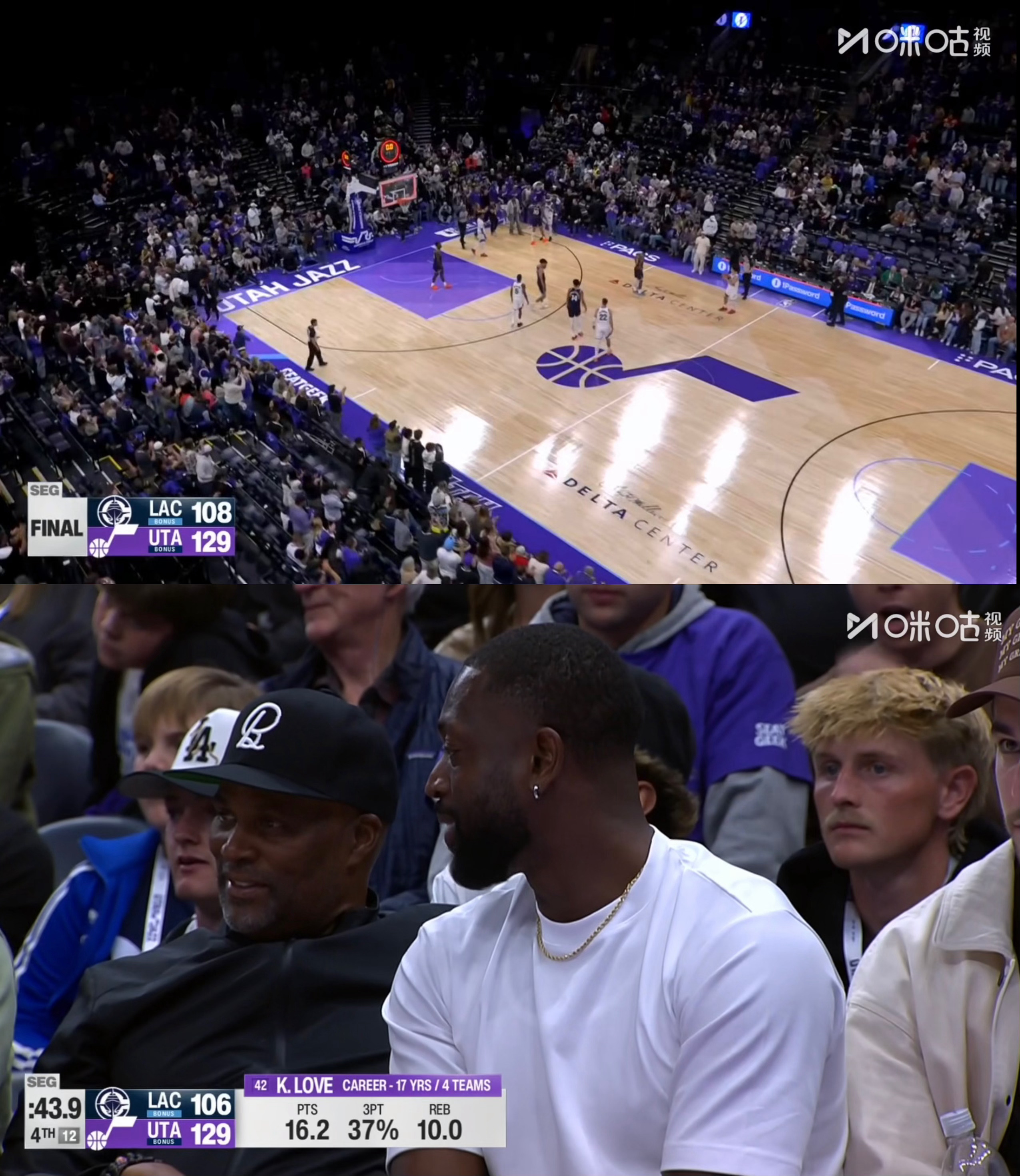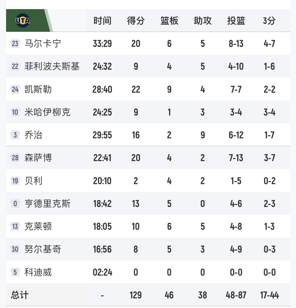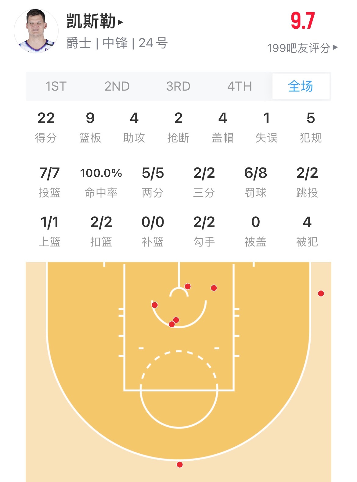 爵士主场129-108大胜快船,凯斯勒22分9板4助攻2抢断4盖帽,100%命中率。