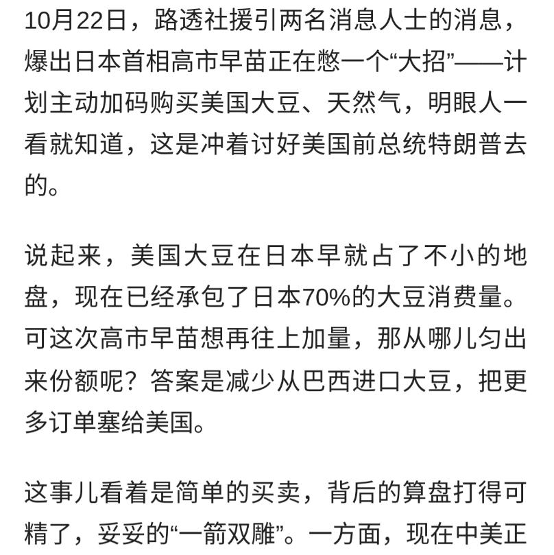 高市早苗搞大事!日本要接盘美国大豆? 就日本这体量,自己能消耗那么多大豆吗?关注日本的大豆去向,采取管控即可! 虽然日本进口美国的大豆不会增加很多,但高市早苗的表态,让特朗普的舆论压力减轻很多,这是高市早苗真正要做的。 她有商业头脑,买美国大豆,让川普高兴支持她,给日本更多实惠,购买的大豆直接转给其他买家,根本不需要进日本。 大家对此事有何看法?