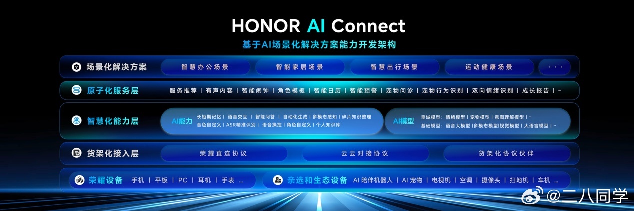 同时,荣耀发布8大AI场景解决方案,覆盖智慧家居、车联等领域,已携手超200家伙伴,推扶持计划。