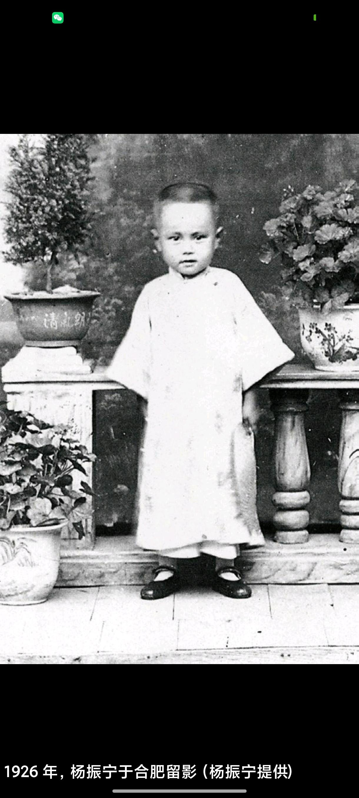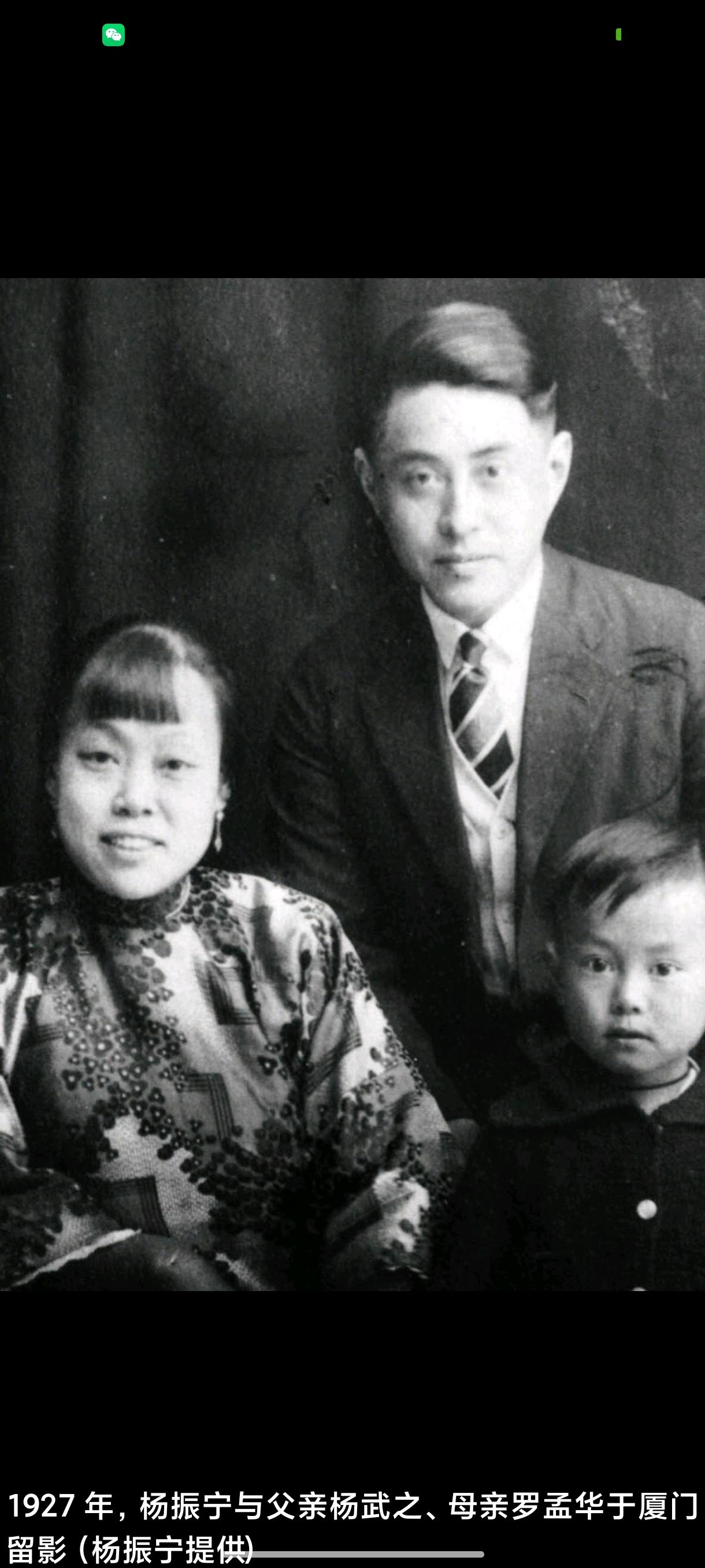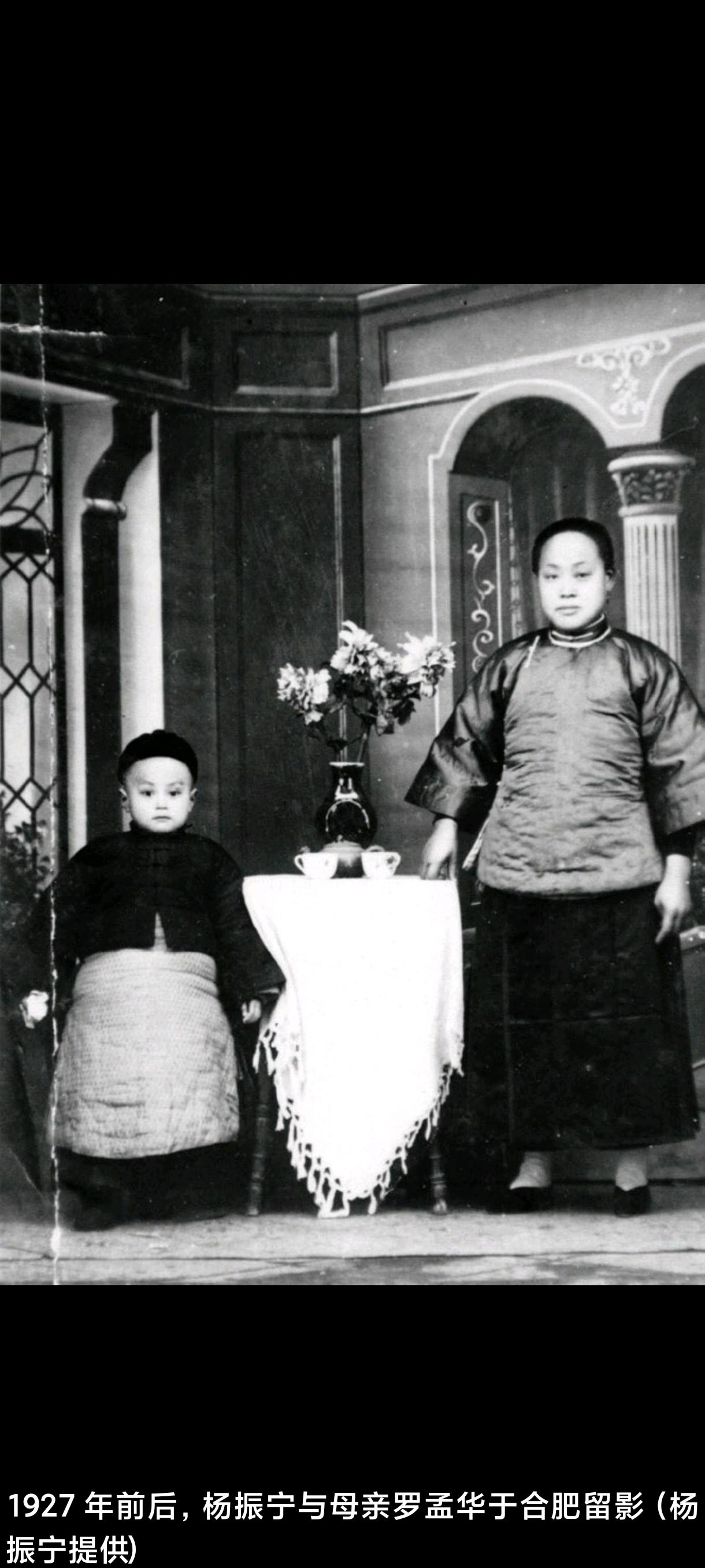 生命有时尽,事业无穷期。 一生痴绝处,无梦到徽州。杨振宁是安徽太湖县都司杨家驹落籍合肥以后的第四代长孙。 1922年10月1日,杨振宁在合肥一所七进大宅的正东房中出生。 ​杨振宁的曾祖父杨家驹,本是安徽凤阳的一个无名小卒。太平天国席卷中国之际,杨家驹在合肥投身李鸿章的淮军,几年时间,因为作战勇敢,后被曾国藩破格提拔为四品武官。 杨振宁的祖父杨邦盛是秀才。 杨振宁的父亲杨克纯【号武之】是留美博士,是中国最早的数学家之一。 真正的是三代人的托举,才有了杨振宁的诺贝尔奖。 杨武之那一代的留学生,许多人从国外留学回来之后,便和原本家里面定亲的旧式老婆离婚,这一方面是因为知识有了差距,另一方面也是当时一种追求爱情自主的新风气。 而杨振宁的母亲罗孟华,既没有接受过新式教育,亦没有接受过旧事教育。 但是归国后的杨武之,并没有抛弃糟糠之妻。 杨武之曾经说:“夫妇应始终如一,胡适之从来不嫌弃他的小脚太太,我很赞成他。” 他们生养了四子一女,终生相互扶持。