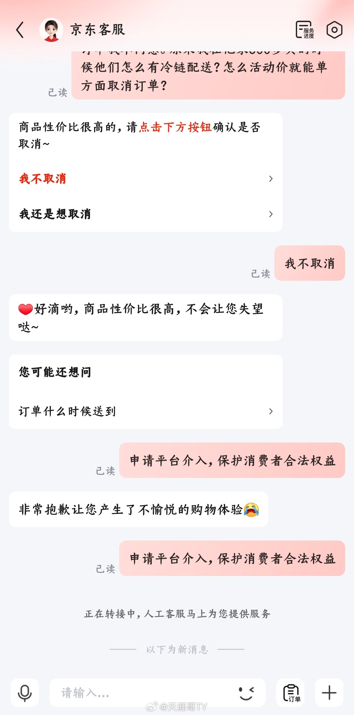 起初提醒冷链问题短信提醒取消订单,然后又说未通过审核。居然单方面取消了订单。太不要脸了,这种情况平台就不能干预吗?找平台客服只有机器人应对,几次要求人工客服就是不见人影。