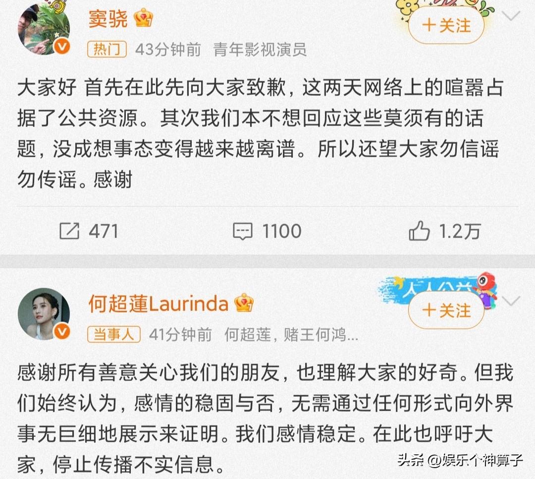 窦骁何超莲发文回应! 10月23日晚,面对网上铺天盖地的传闻,窦骁何超莲纷纷在社