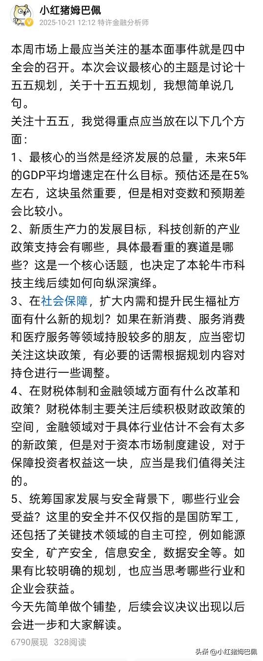 四中全会今天结束了,全会的公报刚发,各家机构都在研读公报,整理潜在的投资机会。 由于今天工作任务还很重,我还来不及细看,简单看到一家机构整理的一个结构图,我觉得比较清晰分享给大家。 前面关于产业尤其是一些细分赛道,大家如果看不明白的话,直接可以跳到第8点投资主线总结。有兴趣还可以再回头看一下,本周二我发布的关于四中全会引领投资方向的前瞻,其实我提的几个问题跟这里的投资主线已经很匹配了。