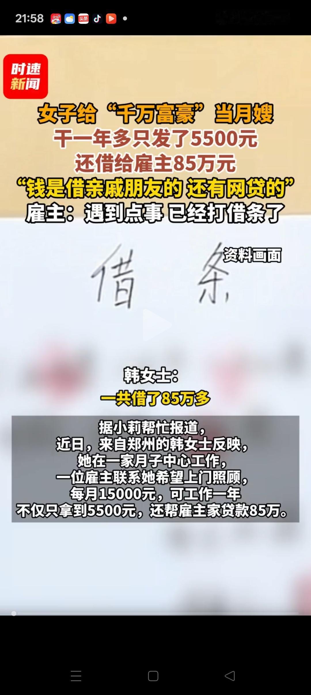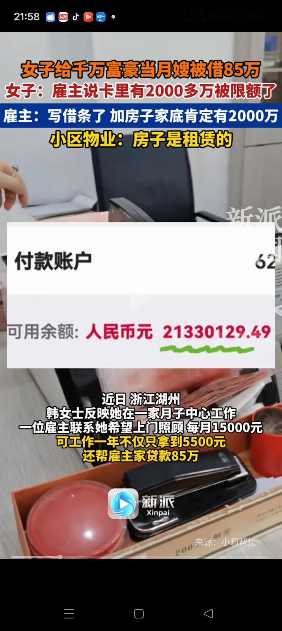 “太蠢了”,浙江,一大妈去富豪家里当月嫂!结果干了一年,不仅承诺的15000块钱一个月的工资没拿到,还倒借给了雇主85万。 雇主真是高人,在月嫂去的第一天就给了5500块钱,也是唯一的一笔钱,让月嫂放松了警惕,觉得她们家确实有钱,还大方。 结果在一个月后,第一次发工资的时候,就以孩子刚在上海买了房,买了车,正在被调查,周转不开为理由,让她帮帮忙,事后会还钱并给利息。还给了她一个截图,显示有2100万的余额,让她大意了。 万万没想到,这位大妈被他们隔三差五的找理由要交保证金,居然一年之内借了85万,还贷了款,简直离谱。 现在雇主一家已经搬去了上海,还承诺会尽快解决,不知道又是不是空头支票[捂脸] 这位大妈从始至终还是看中了人家的利息,但人家看上了你的本金,其实手法并不高明,只怪大妈太蠢了。。。