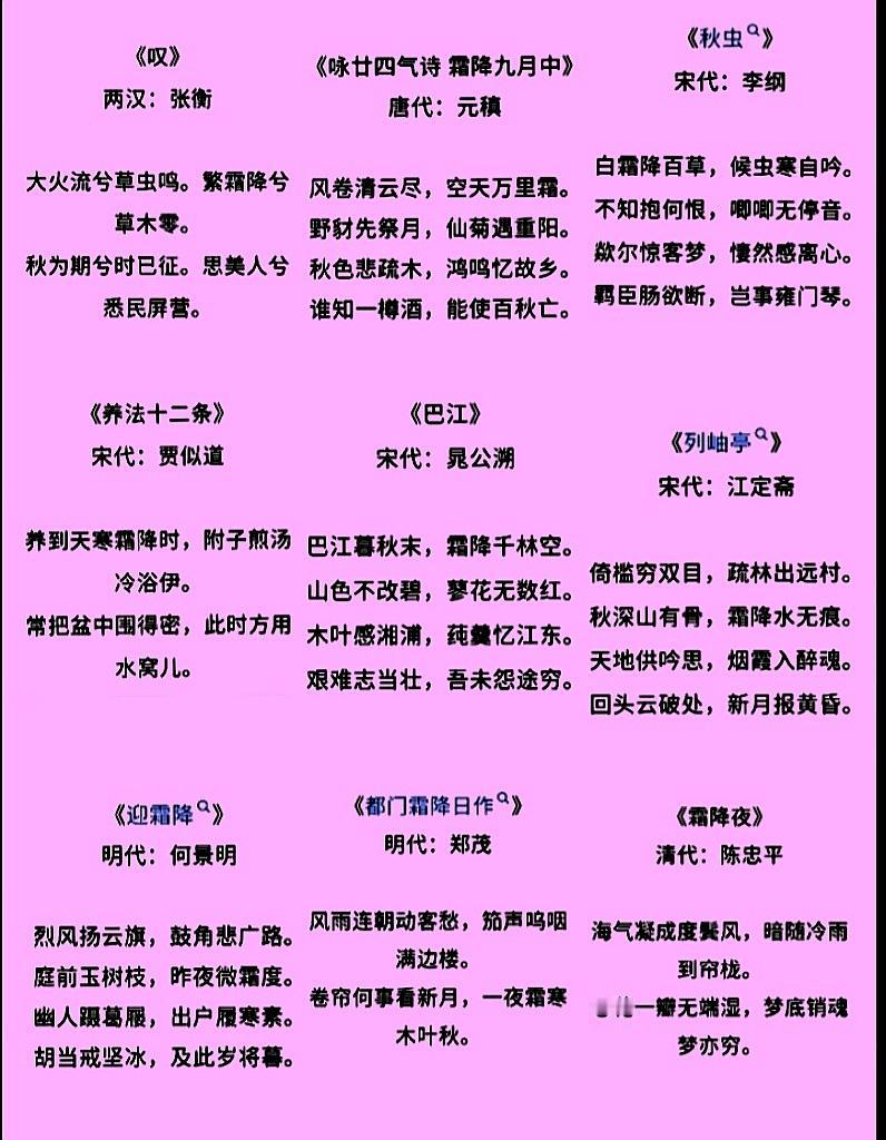 霜降一到天转寒 露凝成霜叶渐残 晨起哈气变白烟 行人赶紧添衣裳