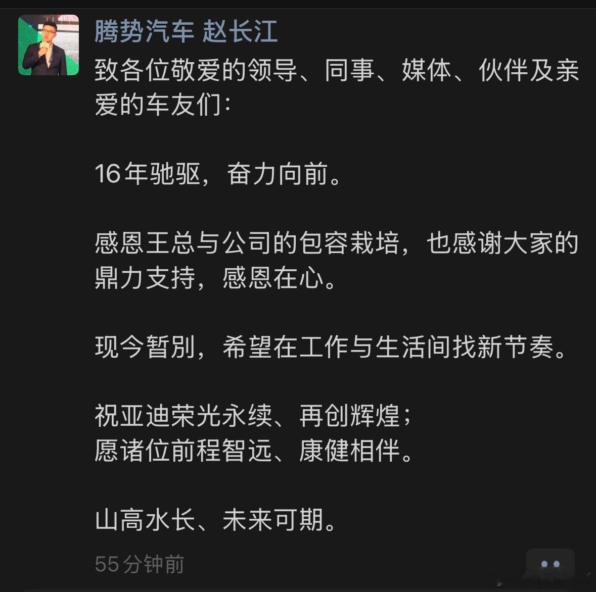 比亚迪赵长江辞职长江总发朋友圈了应届生就加入比亚迪16年的青春呐