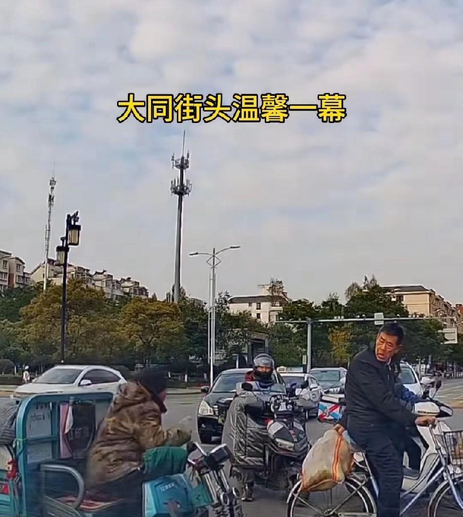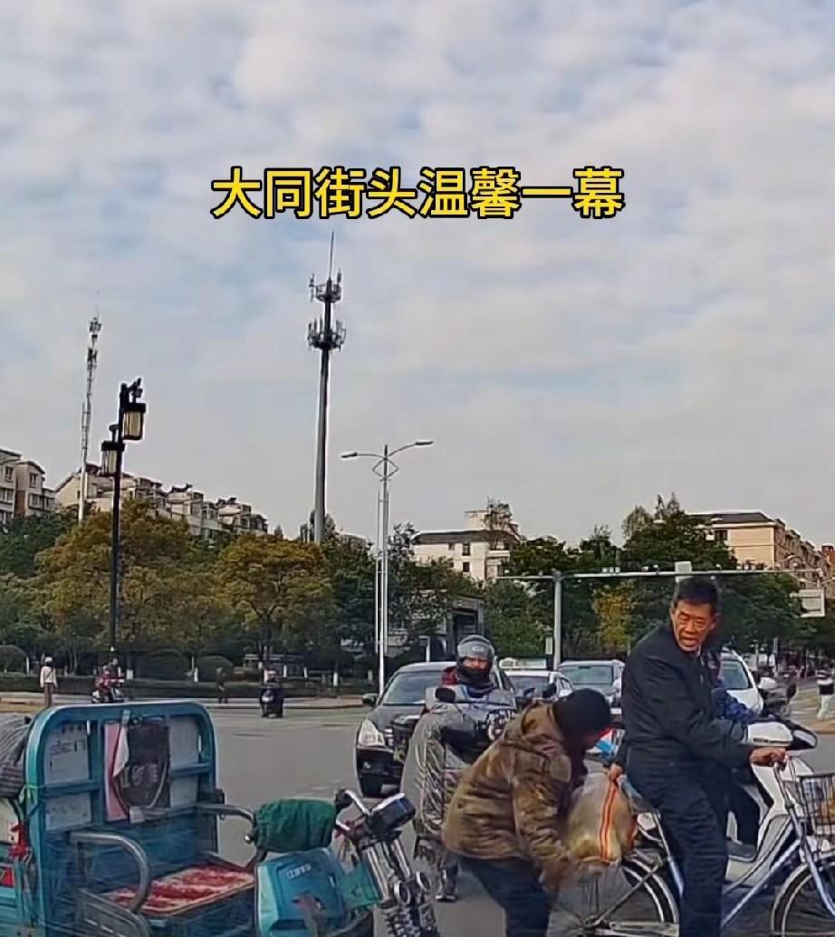 热情直爽的大同人就是这么干的。 骑自行车男子带着一袋土豆快翻了,就在这一瞬间,一个骑着三轮车的人停了下来,帮他用双手扶正,就是这么一个小小的动作,折射出这个城市的人民温暖大度和热情。这一画面被旁边的一个人用手机拍了下来,传到了网上引起了很大的热议。这就是大同普通市民的一个真诚写照,从中可以反映出这座城市的人文面貌和精神。