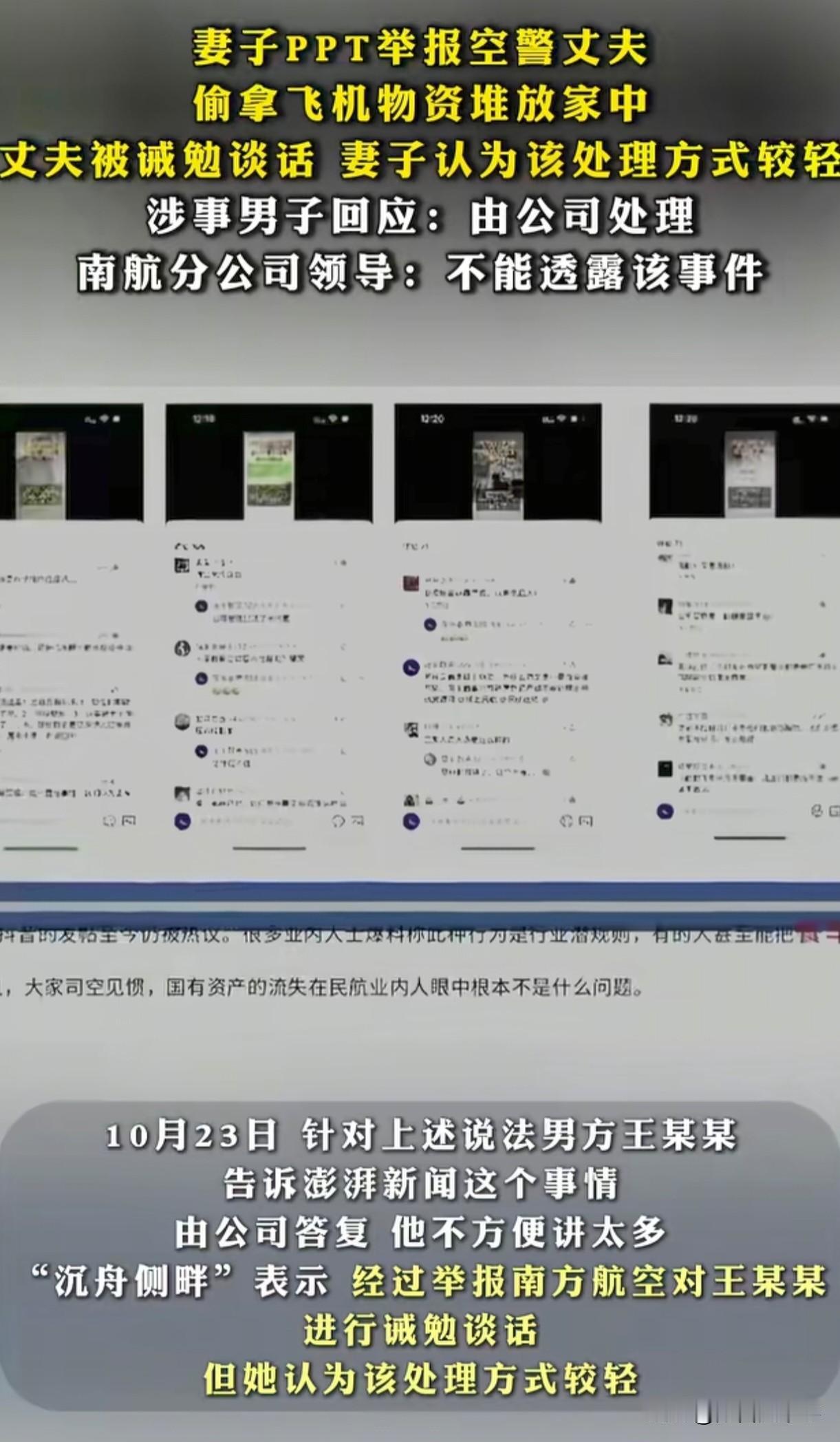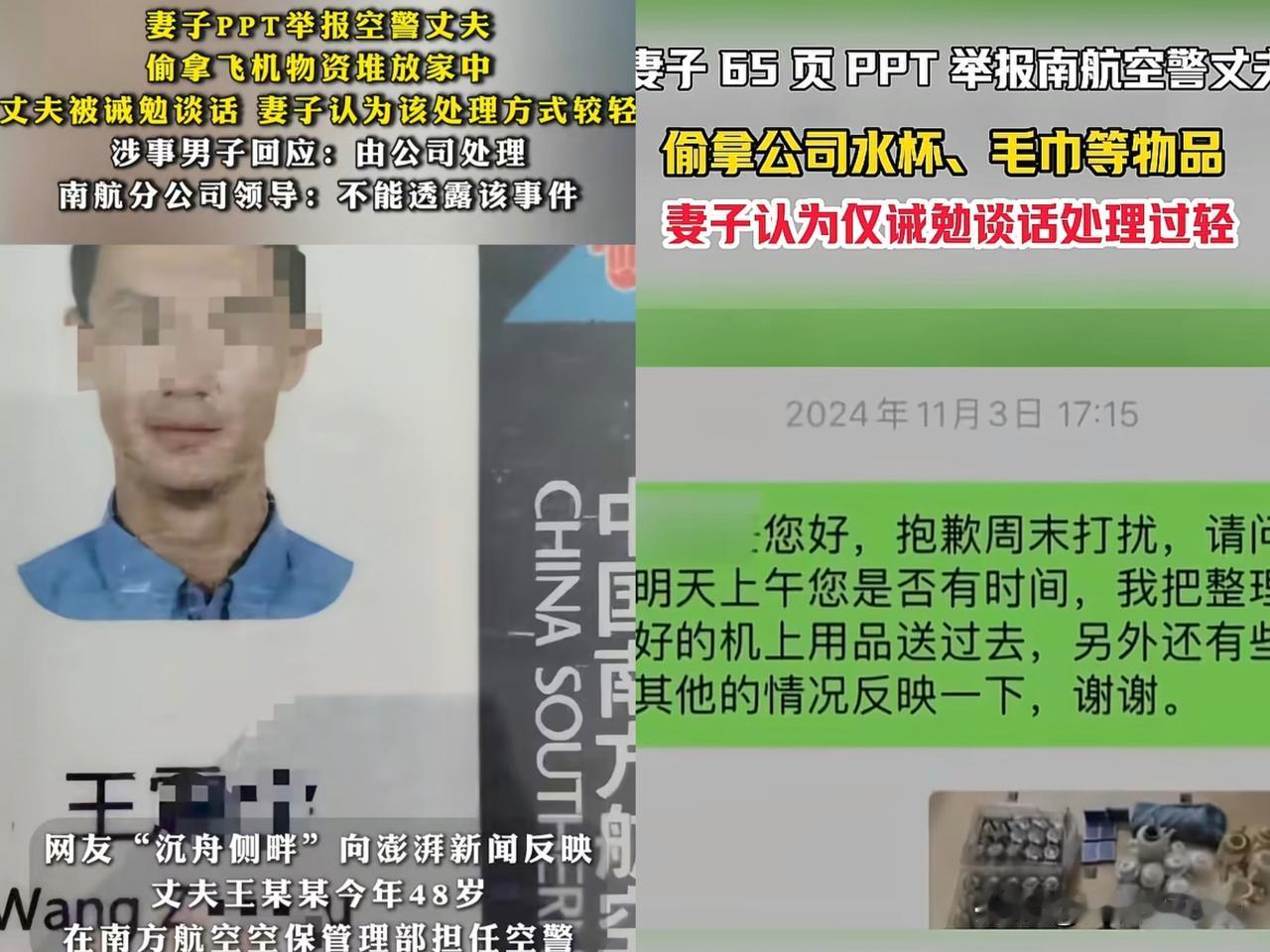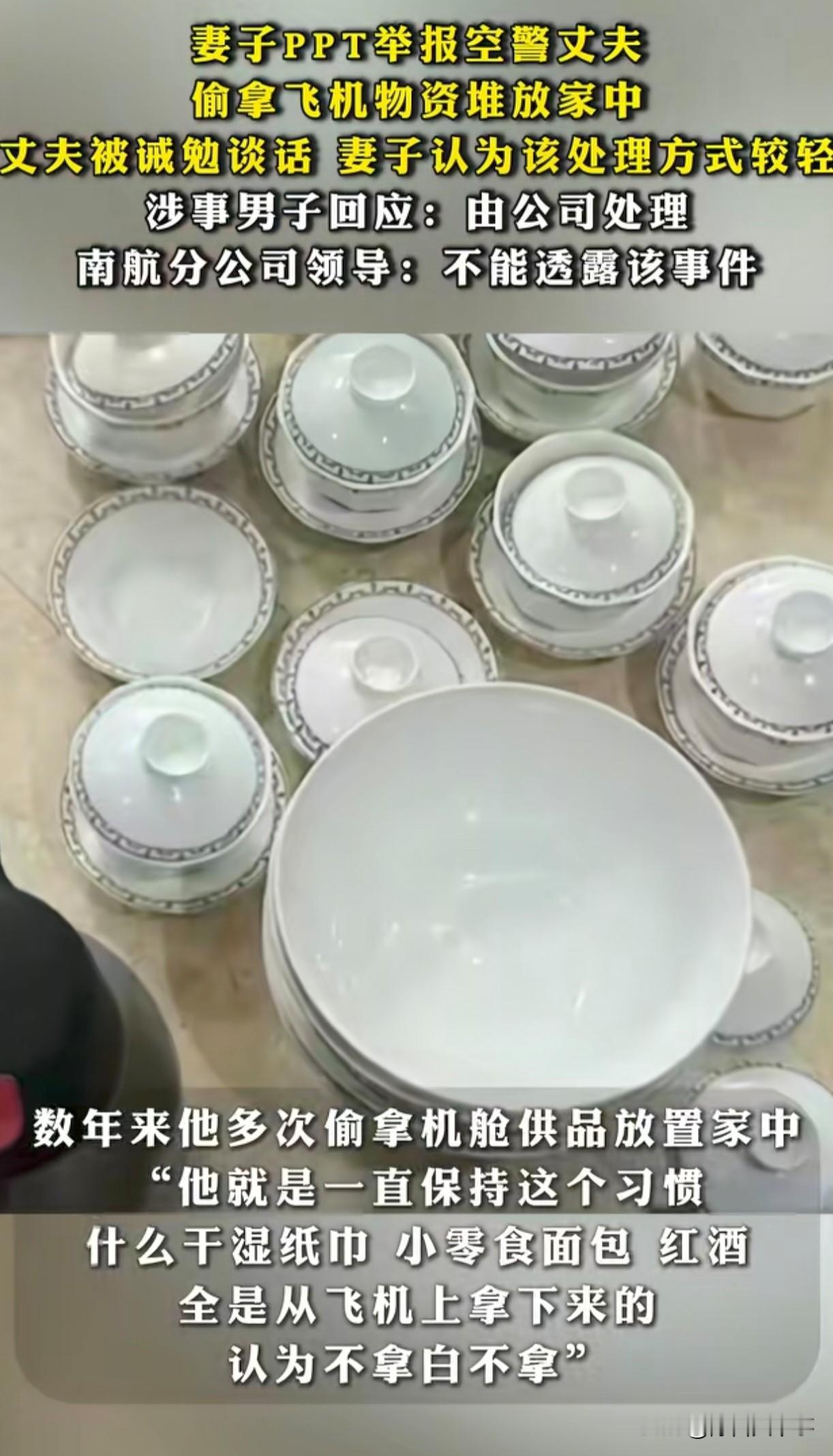妻子为了离婚也是煞费苦心,本以为精心准备65页PPT是要告发什么惊天秘密,结果让人无语了! 这65页的PPT,全是在诉说她丈夫从航空公司拿了哪些小零食,小面包,纸巾,刀叉,水壶等等,没有一项是说明其丈夫犯了什么大错的。 航空公司对此都表示无语,都已经找其丈夫械勉谈话了,她还觉得处罚太轻,非得要丈夫颜面扫地才行。之后只能说“没什么信息好透露的,等总部那边的回应吧! 网友都表示看不懂?丈夫都48岁了,还是在航空公司当空警,再熬几年都要退休了,到时候享福的还不是她。 然而,她却为了这点芝麻小事,准备了60多页的PPT状告丈夫,就只是为了想和丈夫离婚。 再说了,一个男人能把这些东西带回家,恰恰说明他是一个顾家,会过日子的好男人,别人想找都找不到,她反而嫌弃了,咋想的。