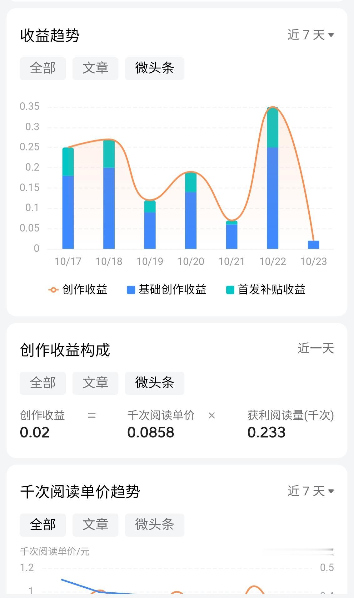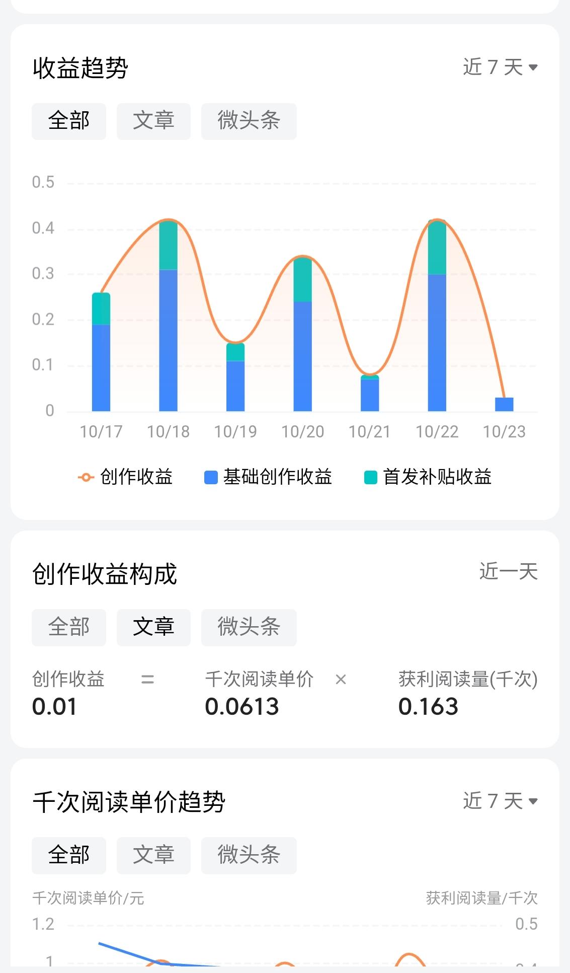 真的无语了,文章千次阅读收益6分钱,还有比这个更火爆的吗?什么样的文章才叫“爆文” 昨天晚上发了一篇文章,结果半小时了展现量为零。 咨询智能客服,竟然让我直接咨询人工客服。 人工客服回答说:您近期可能存在违反头条社区规范的行为,包括但不限于注册、内容低质、交易相关风险等,导致内容被限制推荐。 真的搞不懂我都到底触犯了哪一条,再问都是这几句话。 唉,真的搞不懂了。 我也不知道把这个能不能发出来。 曾经千次阅读收益最高四五块,现在竟然只有6分钱,真的太可笑了。 友友们,你们还有比我更低的收益吗,大家不妨来说说。