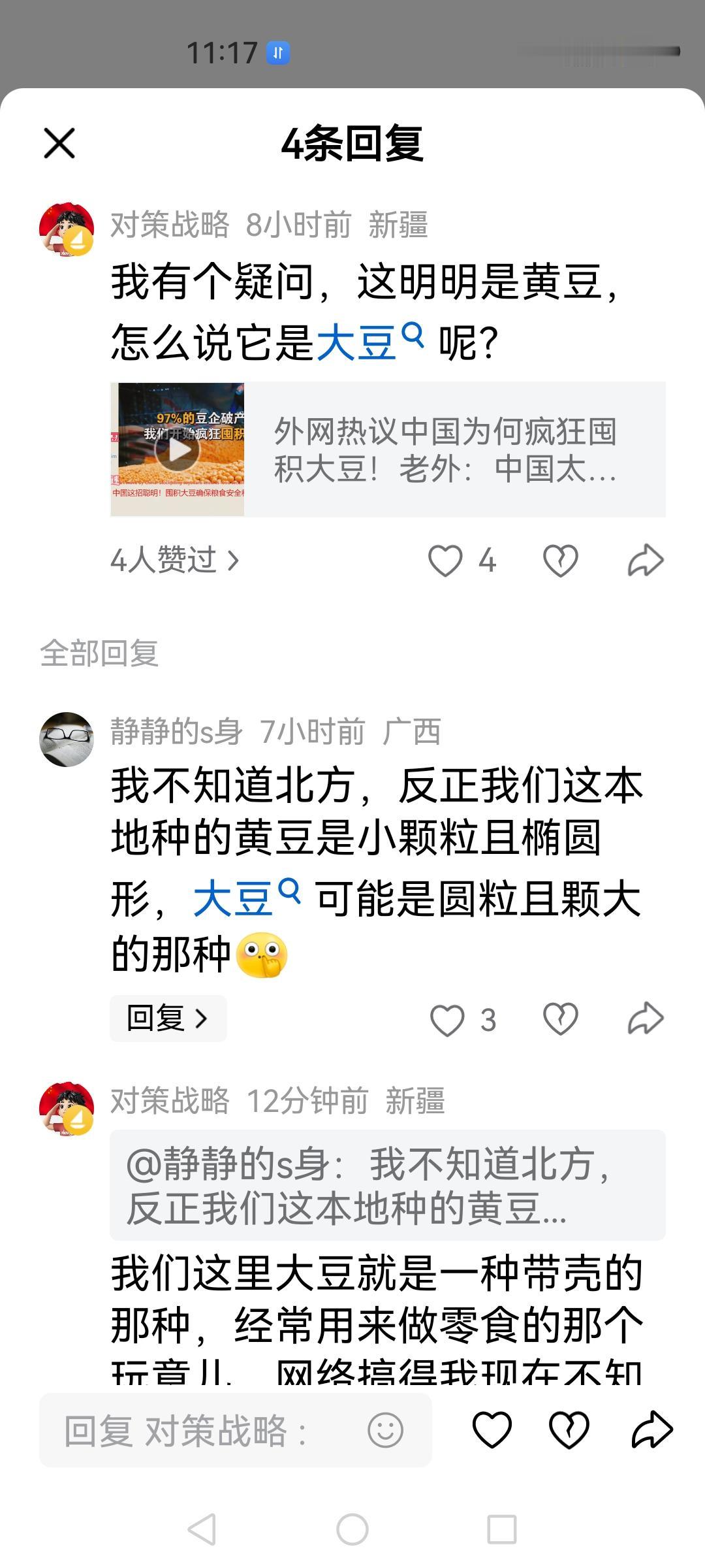 现在发生的国际贸易中的大豆牵动了很多人的心,但是在乌鲁木齐地区,我小时候一直认为大豆就是达板城卖的那种大豆,这两天我才知道弄了半天这玩意儿不叫大豆。那么达坂城地区为什么采用一个错误的名字,你们就不能更正一下吗?你知道这事有多尴尬吗?人家国际贸易中图片上是金灿灿的黄豆,在一篇文章中我就告诉别人,我说你们说的这东西不是叫黄豆吗?怎么可能是大豆呢?经过多人指点我才知道乌鲁木齐所说的大豆一词根本就是错误的说法。文章最后一张截图是中国农业科学院的一位研究员的文章,我截的图。说实话,我们乌鲁木齐地区把达板城的这种豆子就是叫大豆,但这不利于达坂城地区把这种豆子推向市场,错误的就把它改正过来。