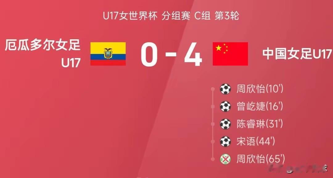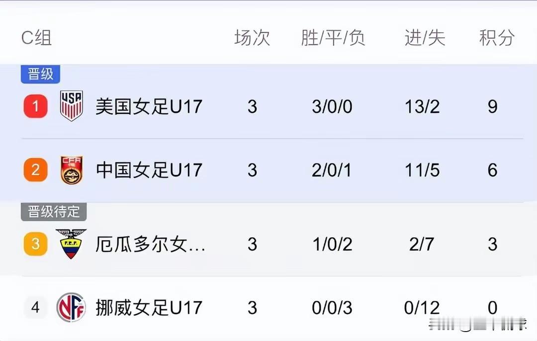 重新进入世界大赛的淘汰赛,这对中国女足来讲,是一个伟大的进步。 4:0战胜厄瓜多尔,获得小组第二,顺利晋级16强。这次中国女足U17表现可以。 第一轮5:0战胜挪威,第二轮2:5负美国,第三轮4:0厄瓜多尔。整体成绩很不错。尤其对美国队的比赛,没有龟缩防守,敢打敢拼! 重新晋级淘汰赛,对于中国足球来说,走到哪里都是胜利!