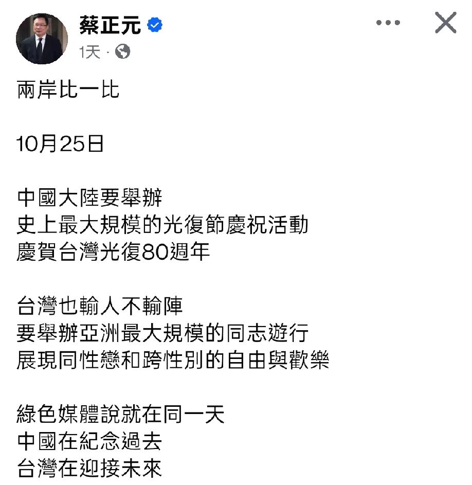 今天是台湾光复80周年,中国举办了热闹的庆祝活动,庆祝台湾脱离日本人的魔爪。 10月25号,本来台湾也是会放假的,冥进当上位之后,把这个假日给取消了。因为他们没有廉耻,认为台湾不需要被光复。 都是中国人,大陆在庆祝自己的兄弟重获新生,冥进当选择在这一天庆祝同性恋与跨性别自由。 这是多么的讽刺 绿媒还有脸说,这是在迎接台湾的未来 区桂芝老师说的对,中国人讲究礼义廉耻 不懂国耻,没有廉耻之心的人和当,没有资格站在中国的国土上