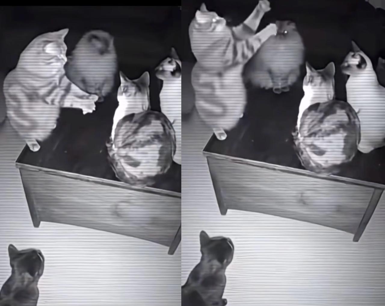 一位网友在家里的监控中,无意中拍到的一组离奇画面,四只流浪猫猫咪围坐一团,一只猫咪在那指手画脚,好像是在讲述着什么事情,其它三只听得全神贯注,跟开会密谋什么似的。 这猫能聊啥呢?没准真是像推测的那样,分享叼火腿肠的“宝藏地点兄弟们,我发现这附近新开了一家大超市里面很多火腿肠,今晚我们就行动” 猫咪之间居然也有这种“信息交流”。总觉得动物没人类聪明,可从这画面看,它们也有自己的社交和“智慧”呀。说不定猫咪们在这城市角落,也构建着自己的“小社会”。