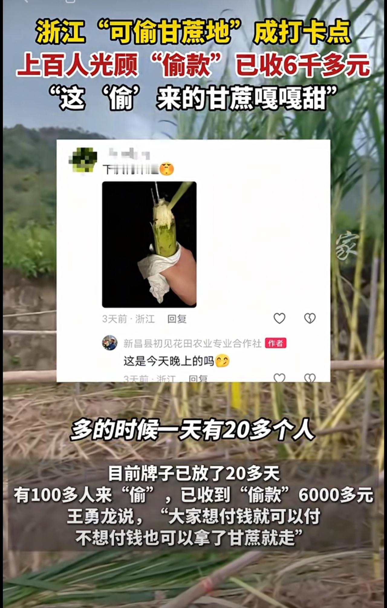 浙江一“可偷甘蔗地”成打卡点,上百网友深夜体验(来源:潇湘晨报、新昌县初见花田农