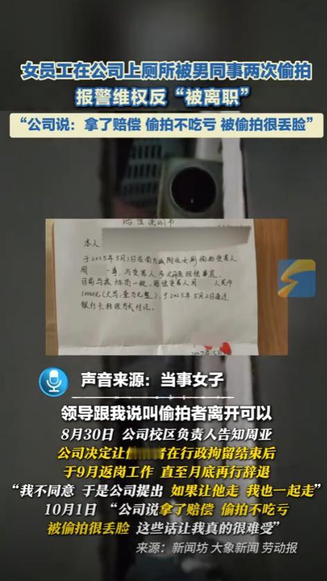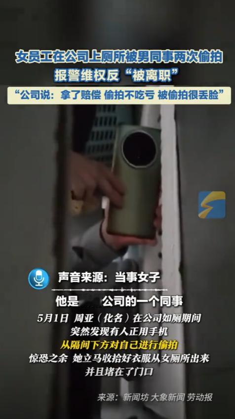 上海,女子在公司女厕所上厕所,突然发现有人偷拍,她叫来保安,看到是公司男同事偷拍。 那天是 5 月 1 日劳动节,周女士留在 “汇智科技公司” 加班,手里还捏着没改完的项目方案,键盘敲到中午才起身去二楼女厕所。 她刚关上隔间门,就瞥见地面与隔板的缝隙里,有个黑色手机镜头正对着自己,屏幕还闪着拍照的预览光。 周女士的指尖瞬间发凉,但她没慌,悄悄掏出自己的手机,对着缝隙里的镜头拍了张取证照,然后故意咳嗽一声说 “外面有人吗?我东西掉地上了”。 外面没应声,她赶紧拉开隔间门,正好撞见保安李叔拿着对讲机巡逻,她拉着保安的胳膊说 “李叔,里面有人拿手机偷拍,你快跟我进去看看”。 两人走进厕所,就看到男同事张某正慌忙把手机往牛仔裤口袋里塞,耳朵尖都红了,手里还攥着半瓶没喝完的矿泉水。 周女士把取证照给保安看,张某一开始还嘴硬说 “手机掉地上了,我捡一下”,直到保安要联系警方,他才低着头说 “我错了,别报警”。 公司人事部刘经理很快赶过来,拉着周女士到会议室说 “小周啊,这事要是报了警,咱们公司的招聘口碑就毁了,客户那边还在考察我们的管理能力呢”。 刘经理还说张某是研发部的核心成员,刚参与完一个百万级项目,要是被开除,项目交接至少要延误半个月,让周女士 “多为自己的工作想想”。 张某也跟着道歉,说自己 “一时糊涂”,当场转了 1 万块钱给周女士,还写了份手写保证书,说 “以后再也不会了”。 周女士看着手机里的转账记录,又想起自己在这家公司干了 2 年,马上要晋升主管,犹豫了半天还是同意不报警,只让公司存档张某的保证书。 可 3 个月 18 天后的 8 月 19 日,周女士特意绕到四楼女厕所 —— 她怕再遇到张某,结果刚进去就看到门缝里有个熟悉的黑色镜头。 她气得眼泪一下子就涌上来,直接拉开隔间门,张某正蹲在地上假装系鞋带,手机就放在脚边的瓷砖上。 周女士一把拿起手机,打开相册就看到十几张自己的偷拍照片,还有上次在二楼厕所拍的,她当场拨通了 110,声音都在抖。 民警赶来后,调取了公司走廊的监控,确认张某两次进入女厕所,依据《中华人民共和国治安管理处罚法》第 42 条,对他处以行政拘留 7 天、罚款 300 元。 周女士以为公司这次会开除张某,可等张某拘留结束回公司,刘经理找她谈话时说 “张某下个月办离职,这期间你别跟他发生矛盾,不然影响团队氛围”。 周女士不同意,说 “他留在公司,其他女同事上厕所都得提心吊胆,这怎么行?” 刘经理却端起桌上的马克杯,慢悠悠地说 “你之前已经拿了 1 万块赔偿,也没吃亏,要是非要现在让他走,那你也得一起离职,这是公司领导层的决定”。 周女士当场翻出手机里存的《女职工劳动保护特别规定》第 11 条,念给刘经理听 “用人单位应当预防和制止对女职工的性骚扰,保障女职工的隐私安全”。 可刘经理只是摆摆手说 “规定是死的,人是活的,你要是不想离职,就忍到月底,不然只能按主动离职算”。 周女士后来找了做劳动法咨询的朋友,朋友说公司的做法违法,但维权可能要耗 3 个月以上,她考虑到自己还要找新工作,最后只要求公司支付 9 月份的全额工资和加班费,就办了离职。 你要是遇到周女士这种情况,会选择先和公司协商,还是直接找劳动部门维权呢? 信源:闪电新闻 2025 年 10 月 22 日《上海女员工厕所遭同事两次偷拍,维权反被公司要求 “一起离职”》;