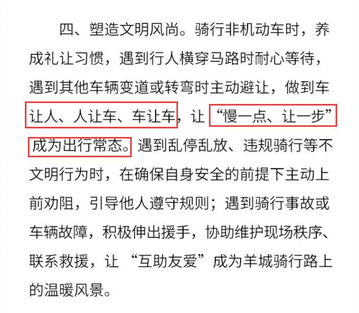 【活在幻想中的那些人】广州最近发布了《文明骑行 有您才行——非机动车文明骑行倡议书》!倡导广大市民骑行时遵守交通法规,营造安全、有序、文明、和谐的城市交通环境! 倡议书整体内容还是挺好的,倡议大家文明骑行,不超速,不逆行,不闯红灯;自觉在非机动车道内行驶等。 不过内容越到后面就越魔幻了,看到最后个人觉得这压根就不是什么倡议书,如果市民真的按照这个倡议书来做的话,那么压根就是一份引发矛盾书。 一起来看看哪些是幻界中的人的建议吧! 车让人、人让车、车让车,让“慢一点、让一步”成为出行常态。(合着出行的初心是要慢?大家都让来让去,都不用走了) 遇到乱停乱放、违规骑行等不文明行为时,在确保自身安全的前提下主动上前劝阻,引导他人遵守规则;(你敢吗?反正我是不敢的,分分钟从劝阻变被殴打) 遇到骑行事故或车辆故障,积极伸出援手,协助维护现场秩序、联系救援,让“互助友爱”成为羊城骑行路上的温暖风景(这个真的没话说了)