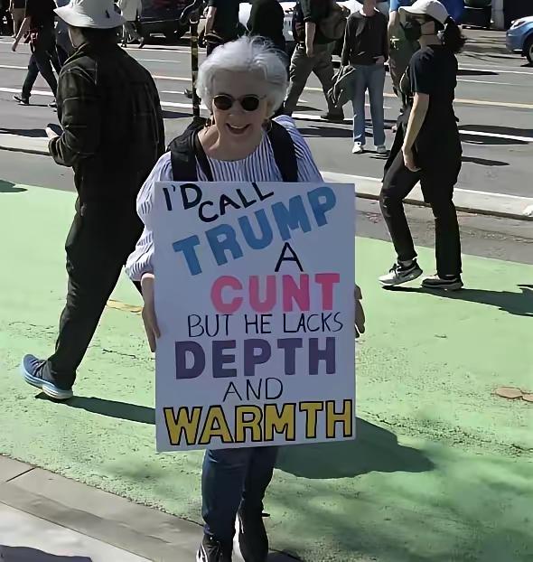 网友问白人老太太反特朗普游行所举牌子英文啥意思?意即“我说特朗普比我下身都不如,既没有深度又没有温度”。[捂脸]老太太确实够狠的。 这老太太有水平,骂人不带脏字的,要不说人啊还是得有文化,所表达的方式就是与众不同,恐怕老特想告她都没戏。 美国老太太太有才了,既骂了川普“才疏学浅”,又骂了川普对人民“冷漠无情”! 对此你怎么看?