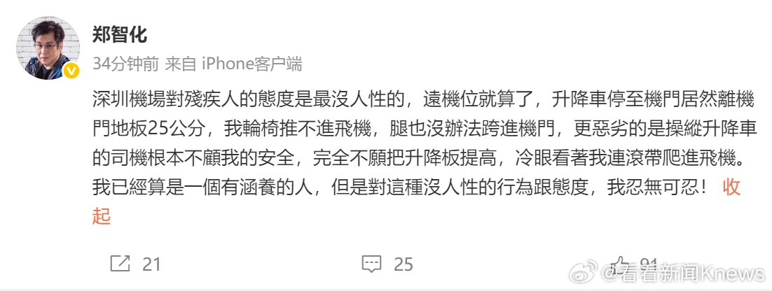 【歌手#郑智化怒斥深圳机场#】10月25日,知名歌手郑智化发博怒斥深圳机场对残疾人没人性,他写到:深圳机场对残疾人的态度是最没人性的,远机位就算了,升降车停至机门居然离机门地板25公分,我轮椅推不进飞机,腿也没办法跨进机门,更恶劣的是操纵升降车的司机根本不顾我的安全,完全不愿把升降板提高,冷眼看着我连滚带爬进飞机。
