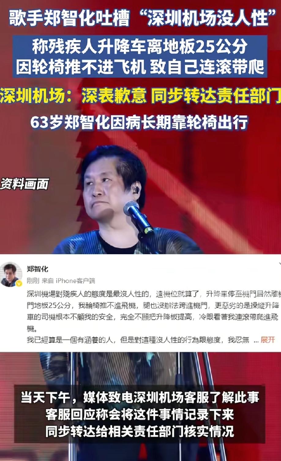 歌手郑智化怒了! 他斥责深圳机场对残疾人的态度没人性,升降机门离舱门25公分 称自己“连滚带爬进飞机” 他表示自己也算是一个有涵养的人,但是对此他忍无可忍。 郑智化当年以一首《水手》火遍了大江南北,曾经那个以坚强形象面对大家的少年,如今因身体原因只能靠轮椅出行,没曾想在机场却遇到如此让他不悦的事。 对比机场也做出回应,并表达了歉意,同时也转达相关责任部门合适情况!