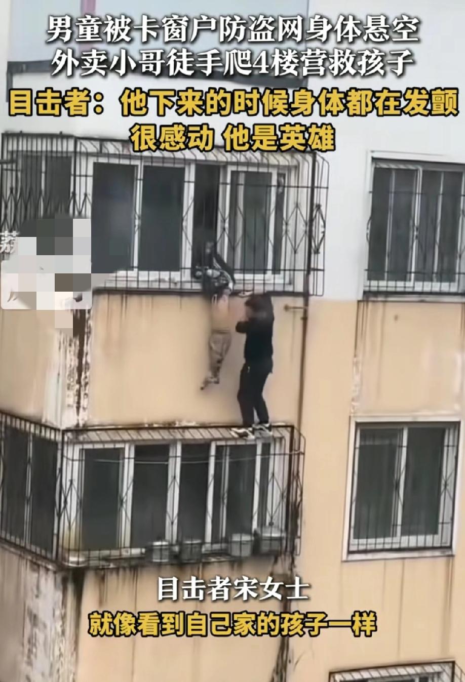 原来英雄就在身边 孩子悬挂在4楼窗户外的护栏 眼看摇摇欲坠,孩子妈妈快抓不住了,这时恰巧在外小哥崔先生路过,他徒手爬上楼将孩子塞回屋内。 据目击者称,他下来的时候整个人都瘫软了。 据知情者透露,当时外卖小哥也没多想,看到孩子有危险就爬上去救人,他当时看着孩子就像自己的一样,也没考虑自身的危险,下来时全身发抖。 让我们为这个小哥点赞,相信好人必有好报,他在平凡的岗位上却有一颗善良的心,这样正能量满满的人,我们更应该广泛传播,让更多的人学习他的精神。 你们觉得呢?