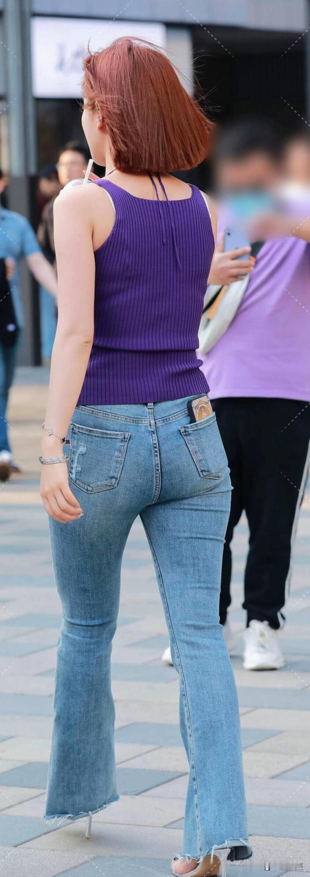 紫色吊带配微喇牛仔裤,手拿奶茶随性又时髦,这穿搭把夏日活力感拿捏得恰到好处~
