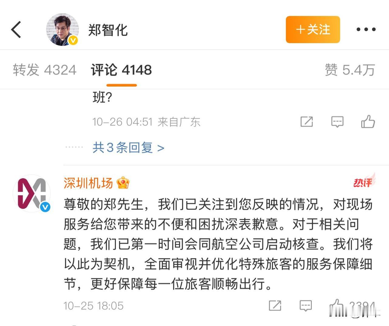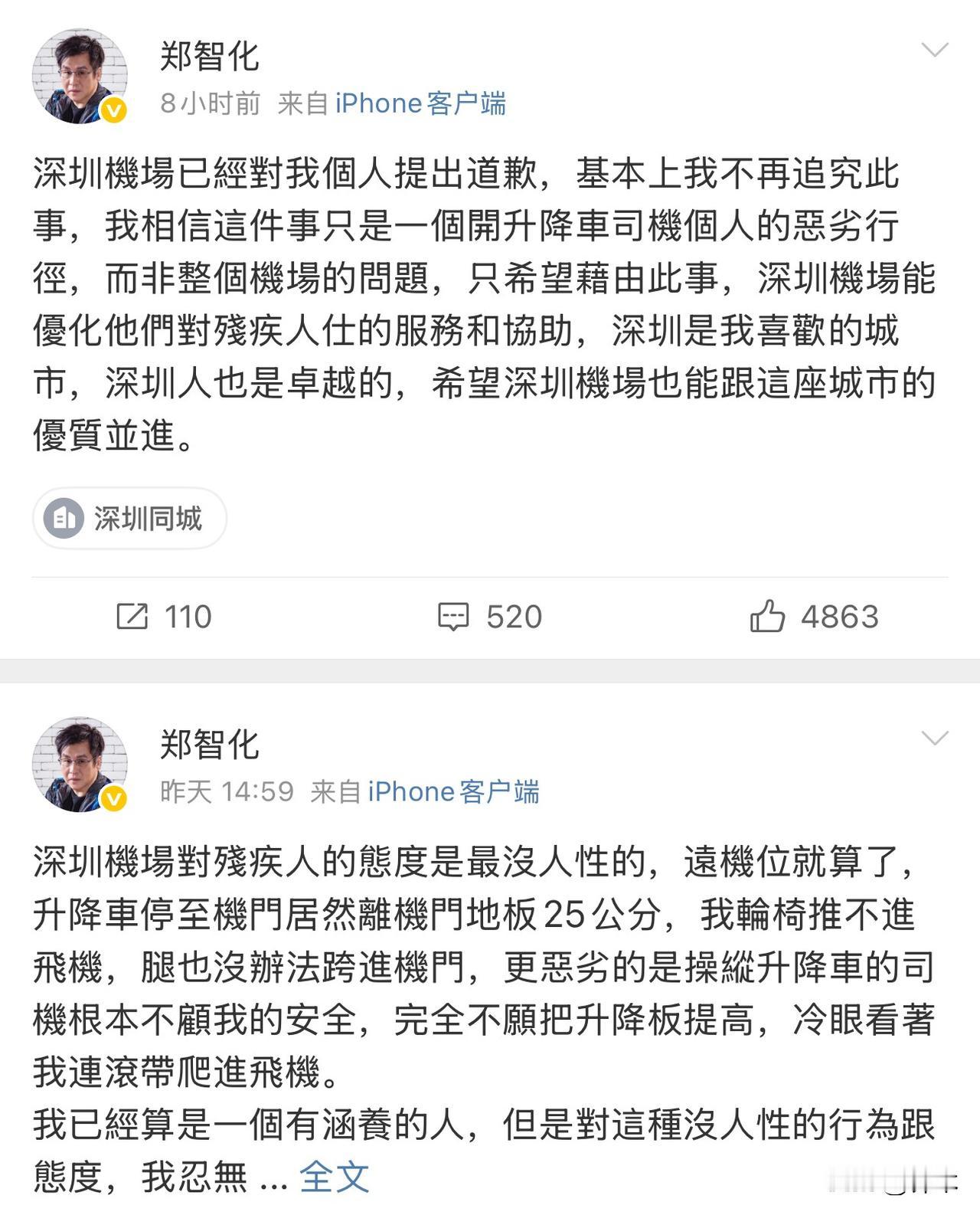 看到郑智化一个投诉让深圳机场上热搜,原来是11月的残运会就要在深圳举办。 可把大伙急得不行,这不,深圳速度来了。 歌手郑智化,在社交媒体投诉深圳机场,让他连滚带爬上飞机,工作人员完全不顾他死活。3小时后深圳机场就已经回复,并私下道歉。立马整改,态度端正。 并没有传闻里的冷漠态度,倒是让更多有需求的人纷纷留言。让更多需求被看见,有问题能改进就是进步。 相信深圳速度,也相信来了深圳就是深圳人,大家觉得呢? 郑智化 深圳