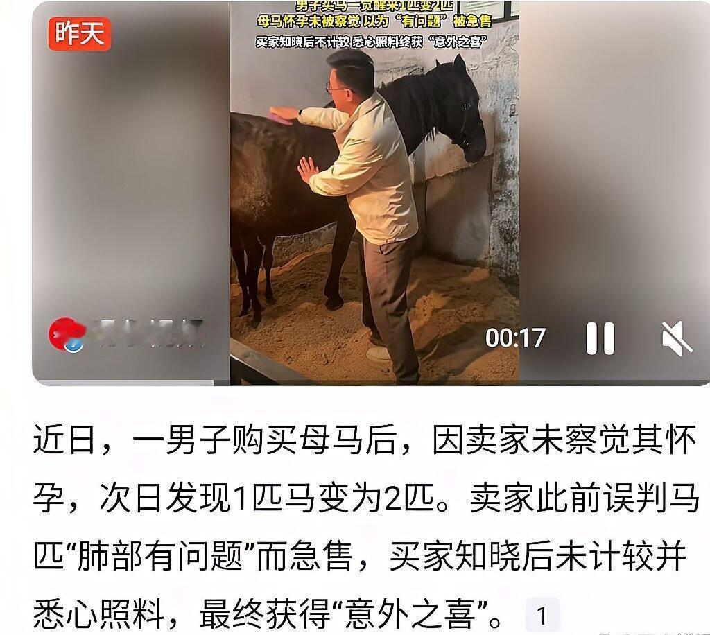 山东淄博有个刘先生,最近走了个“狗屎运”——不对,是“马屎运”。 事情是这样的,他花几千块钱买了匹母马。估计这马看着有点毛病,不然不能这么便宜。结果你猜怎么着?买回来的第二天早上,他去马棚喂马,直接傻眼:咋一匹马变两匹了? 原来那匹母马半夜悄悄生了个小马驹!刘大哥自己都懵了,本来就想买匹马代步,这下倒好,买一送一,白捡个崽。 这便宜占大了。网友都开玩笑说,这属于“理财产品”,还是年化收益率惊人的那种。估计卖马的人都得拍大腿,早知道再等一天,就能多卖一份钱。 不过话说回来,这种好事也就是碰巧。估计刘大哥买马的时候根本没看出来马怀孕了,卖家也没看出来(或者故意没说),这才让他捡了个漏。生活有时候就这样,你永远不知道明天醒来会发生啥。 这种意外惊喜比中彩票还乐呵,毕竟是个活生生的小生命。现在刘大哥得操心怎么养两匹马了,但这幸福的烦恼,多少人想有还没有呢!
