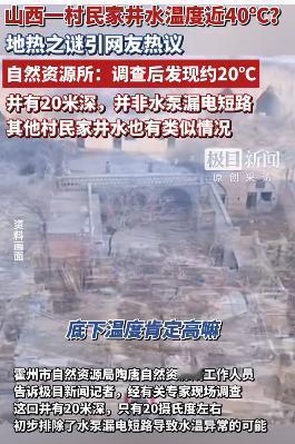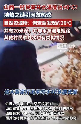山西霍州,一村民发现自家打的井水温度非常高,大约有30到40℃,可以直接用来洗漱,但是其他村民家中的井水却十分冰凉。有关部门立即派人前往调查,发现水温在20℃左右,也没有发现水泵漏电。网友:底下有温泉?   10月23日,在山西霍州陶唐峪乡成庄村,一段村民用井水洗脸的视频最近在网上火了。   视频里,农户李大叔捧着刚从井里抽上来的水往脸上泼,满脸诧异,这水咋温乎乎的?往年夏天摸上去都透心凉,现在直接洗都不用掺热水。   旁边的博主伸手试了试,对着镜头说“感觉有三四十度”,而不远处邻居家同期打来的井水,摸上去还是凉丝丝的,泼在地上都带着凉意。   这一热一凉的反差,让“霍州藏着地下温泉”的猜测在网上传开了。   这口让村民犯嘀咕的井,是李大叔家自己凿的老井,已经用了十几年,井深20多米。   据李大叔说,过去不管夏天多热、冬天多冷,井水温度都没大变化,夏天喝着冰爽,冬天也只是不结冰而已。   直到最近半个月,他发现刚抽上来的水手感明显不一样,晚上洗漱不用等热水器,直接用井水就刚刚好。   消息传到村里,不少人跑去围观,有人开玩笑说“以后洗澡都不用交水费了”,也有人悄悄担心“是不是地下有啥地质变化”。   这口突然“变温”的老井,很快引起了当地部门的注意。   村委会工作人员先上门核实,打开井盖用温度计测了几次,发现水温根本没有网传的三四十度,也就20来度。   刚抽上来的时候确实比常温略高一点,放桶里晾几分钟就凉下来了。   工作人员解释说,这口井的井盖常年盖着,平时很少打开。   随后,霍州市自然资源局陶唐自然资源所的专家带着专业设备赶到现场。   他们先排查了最常见的隐患,水泵漏电,用仪器检测电路后发现完全正常,排除了漏电加热井水的可能。   专家连续观察了大半天,发现井水温度始终稳定在20℃左右,而且附近几户村民家的井水也有类似“刚抽上来略温”的情况,只是没李大叔家这么明显。   综合勘查结果,专家给出了答案:水温略高是两个因素凑到了一起。   一方面,井里的水泵长时间运行会产生热量,虽然单次产热不多,但老井深度有限,热量不容易扩散。   另一方面,井盖常年密闭,地下形成了天然的保温环境,热量积攒下来。   刚抽上来的水就带着温感,等接触地面空气后,温度很快就降回正常水平。   霍州这口井的情况,就是水泵产热让水温比地下平均温度高了一点,再加上密闭保温,才造成了“水温飙升”的错觉。   网友们的讨论也很有意思。有人说“差点以为霍州要建温泉度假村,广告词都想好了”。   也有人分享自家经历,老家以前有口井夏天摸着也是温的,旁边的就凉,当时纳闷了好久。   更多人认可官方的调查结果,觉得“20度才合理,三四十度确实太夸张了”。   绝大多数时候,找专业人员排查设备、管道这些“身边因素”,就能找到答案。   回头看霍州那口被猜测“藏着温泉”的老井,其实是地下环境稳定性与日常设备使用叠加的结果。   它提醒我们,生活里的“稀奇事”往往藏着科学道理,与其轻信传言,不如等专业调查给出结论。   而地下水的温度变化,就像地球的“微表情”,读懂它需要科学的眼睛,更需要理性的心态。   毕竟,比起“地下有温泉”的浪漫猜想,搞清楚真相才更让人踏实。
