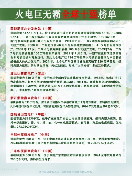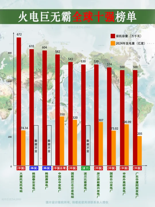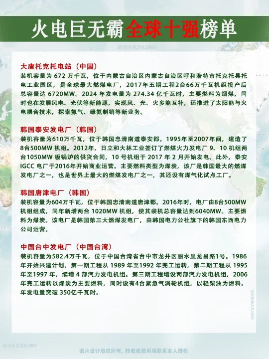装机容量为 672 万千瓦,位于内蒙古自治区内蒙古自治区呼和浩特市托克托县托电工业园区,是全球最大燃煤电厂,2017 年五期工程 2 台 66 万千瓦机组投产后总容量达 6720MW。2024 年发电量为 274.34 亿千瓦时,主要燃料为烟煤,同时也在发展风电、光伏等新能源,实现风、光、火多能互补,还推进了太阳能与火电耦合技术,探索氮气、绿氨制销等新业务。