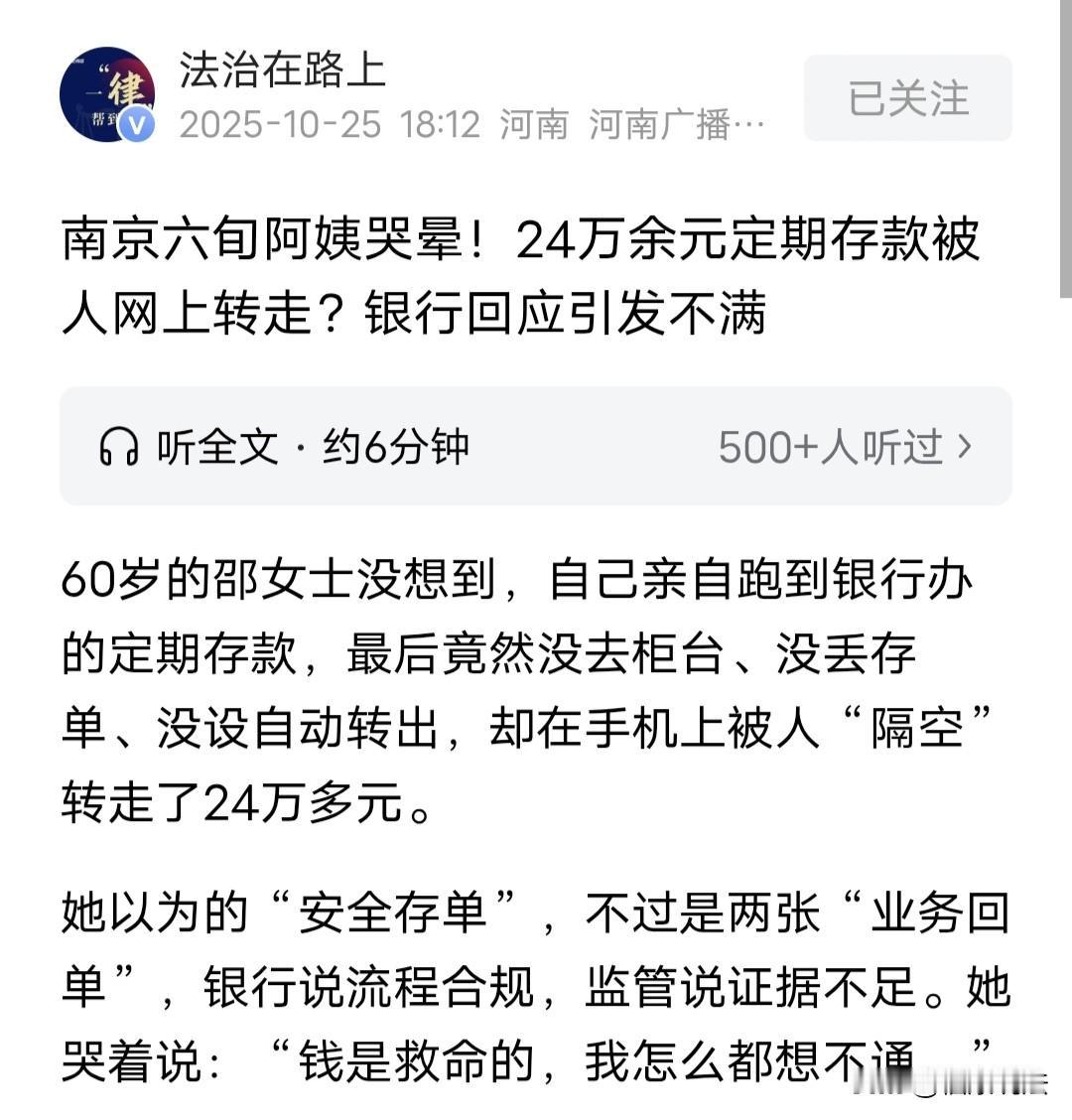 “哭晕了!”江苏南京,60岁女子把积蓄分别存进2家银行,一家存20万,一家存14.2万,要求存定期,特意要了纸质存单,拿到“存单”后她也没细看,9个月后,女子接到一通电话,自称短视频平台客服,说她开通了一份保单,让她扫脸、输密码、验证身份才能取消,女子一一照做,次日,女子收到2家银行发来的短信,一账户有102039.32元被转走,第二家银行账户那142000元被转走,合计24万余元,还有部分流出境外,女子急忙拿着两张“存单”去找银行,不料,银行说那不是存单,而是“业务回单”而且,你签字了。女子气的反问:我要存单,你给我回单,我咋知道这有啥区别? 60岁的邵女士省吃俭用攒了一笔钱,她打算用这笔钱看病,在2024年1月6日,她带着钱准备存银行里。 邵女士分别去了两家银行,在第一家银行她存了20万,第二家银行存了14.2万。 她在存钱时和工作人员再三叮嘱,这笔钱是留着看病的,必须存定期,而且,只能本人拿着身份证去柜台才能支取。 另外,邵女士要了纸质存单,她觉得存单握在自己手里才安全。 不过,工作人员当时给了她两张打印纸,邵女士接过来时以为是存单,而工作人员也没说什么,她拿着“存单”回家放进了抽屉,也没有在好好的看一眼。 就在邵女士以为存款存的一切妥当时,一个意外的发生,让她欲哭无泪。 2024年10月30日,这天下午,邵女士接了一个电话,电话里那人说他是短视频平台的客服,说邵女士开通了一份保单,不取消下个月就要扣费。 邵女士有些疑惑,不过客服能报出她的名字,手机号,还都对了。 邵女士心想此前存钱时,说过不是本人去柜台,别人谁也不能取钱,一想到这些,她就信了客服。 接下来,客服告诉她下载一个APP,说那是“官方取消工具”,然后,让她扫脸、输密码,这样验证身份,才能解除绑定。 邵女士一一照做…… 晚上,邵女士的儿子回家后,看到母亲一直看着手机两眼直勾勾的,神情涣散,就关心的问了一下,听完后,儿子意识到母亲被骗了,带着她去报了警。 次日上午,邵女士收到了两家银行的短信,这下她傻眼了,她在第一家银的行账户有102039.32元被转走了,而第二家银行账户那142000元也转出去了。 两家银行账户被转出共计244039.32元。 让邵女士两眼一黑的是,部分钱已经流向境外,恐怕难以找回了。 邵女士本来是打算用这笔钱看病的,结果钱被转走了,她想不通,也不甘心,便拿着“存单”去找银行。 可是,两家银行的工作人员分别表示,邵女士的“存单”不是存单,而是“业务回单”。 什么是“业务回单”?邵女士根本不懂。 工作人员解释说,回单不是资金所有权凭证,只是证明她来办过业务的收据。 通俗的地说,业务回单就是你去银行办完业务,比如存钱、取钱、转账啥的,人家给你打印出来的一张纸条,证明你这笔业务已经办好了,上面会写着交易时间、金额这些信息,留着自己查看交易对不对得上。 而且,工作人员还说,邵女士办的是“银行卡定期”,也就是说这个和手机银行绑在一起,她只要扫脸、输密码,在手机上就可以把定期转成活期,然后再转走。 最让邵女士有苦说不清的是,银行提供的凭证上,有她的签字。 而且,银行给她的回答是,已经告知其风险,签字已确认,流程也合乎规范。 邵女士不服气,反问对方:“我签字就能说明我明白了吗?我要存单,你给我回单,我哪知道这有啥区别?” 钱找不回来,邵女士心急如焚,银行表示监控只能保存2个月,所以,录像无法提供。 她去有关部门投诉后,对方表示,邵女士现有的证据无法认定银行存在违规操作。 2024年10月31号,警方对邵女士这件事立案了,他们分析这是一种“社工诈骗+远程操控”的案件。 邵女士很无奈,她哭着说:我这钱是救命的,我真的想不通! 很同情女士的遭遇,但实事求是说她有很大责任,60岁了,存钱又不是第一次,存单和回单不一样总能看出来的,要是她当时仔细看下就好了。 另外,邵女士接了陌生电话,对方要她干啥她就干啥,尤其是下载app,说她不懂却又懂安装操作,怎么就没有一点警惕性和安全意识呢! 从法律方面分析,此事中,邵女士作为消费者,到银行办理存款业务,她有权利清楚地了解自己办理的业务到底是什么。 《消费者权益保护法》第8条规定:消费者享有知悉其购买、使用的商品或者接受的服务的真实情况的权利。 银行使用的“存单”“回单”“定期”“卡内定期”这些专业术语,对于老年人来说可能很难理解。 银行没有用更通俗的语言向邵女士解释清楚这些术语的区别,也没有设置“二次确认”环节来确保邵女士真正明白自己办理的业务内容,这就导致邵女士在不知情的情况下办理了可以远程支取的银行产品。 银行这种行为没有充分保障消费者的知情权,违反了消费者权益保护法中关于经营者应真实、全面提供商品或服务信息的规定。 你觉得邵女士的钱能追回来吗?