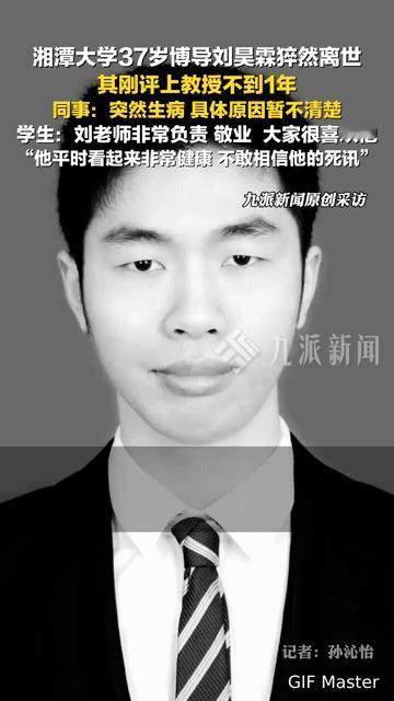 37岁博导猝然离世,刚评教授不足一年!湘潭大学师生痛别“健康又敬业”的他 “他平时看起来特别健康,真不敢相信……”10月25日,湘潭大学计算机学院37岁博导刘昊霖突发疾病离世,消息传来,师生无不扼腕。 他刚评上教授不到一年,是学生眼中“负责又敬业”的好老师,同事也对其突然病倒的原因满是疑惑。 从四川大学本硕博一路深造,到入职湘大深耕计算机领域,他的学术生涯本应更长。如今,学院官网上他的照片已变为黑白,遗体告别仪式的安排,更让这份遗憾沉甸甸。生命的意外休止符,留给学界与师生的,是无尽的惋惜。