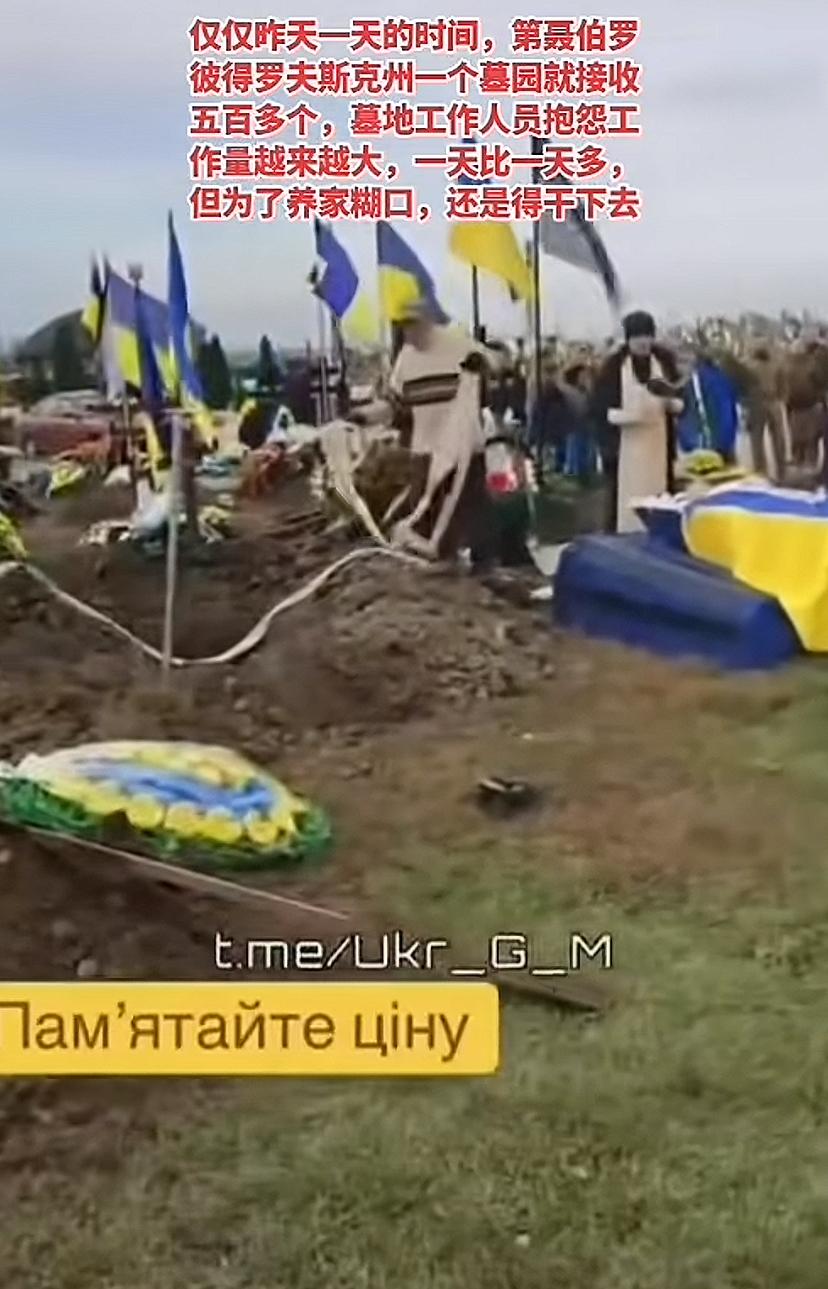乌克兰一州的墓园工作人员抱怨,工作量越来越大,挖的坑一天比一天多,为了养家糊口,只能坚持干吧。 从视频里看到,不少坑是现挖的,国家虽困难,这方面流程不能省,操办得还是很有体面,送行的人不少。