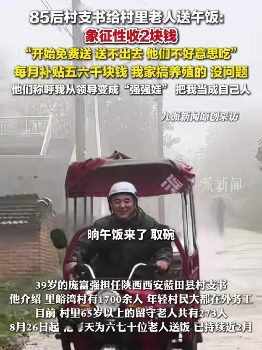 跟着这样的村干部,想不致富都难。 85后的村支书给老人送饭,怕不好意思吃,象征性的收他们2元,谁都心里明白,2元钱能吃一顿午饭吗?收钱是让老人吃的有面子,有尊严。 他说自己直播带货,还有养殖业,每月补贴五六千让老人吃饱饭没问题。 他不仅为老人考虑,下一步定了一个目标,想让更多在外的儿女们在家创业。 他能为村民考虑,把他们当家人,村里人也把他当成了自己的家人,以前都喊他领导,现在叫他“强强娃”。