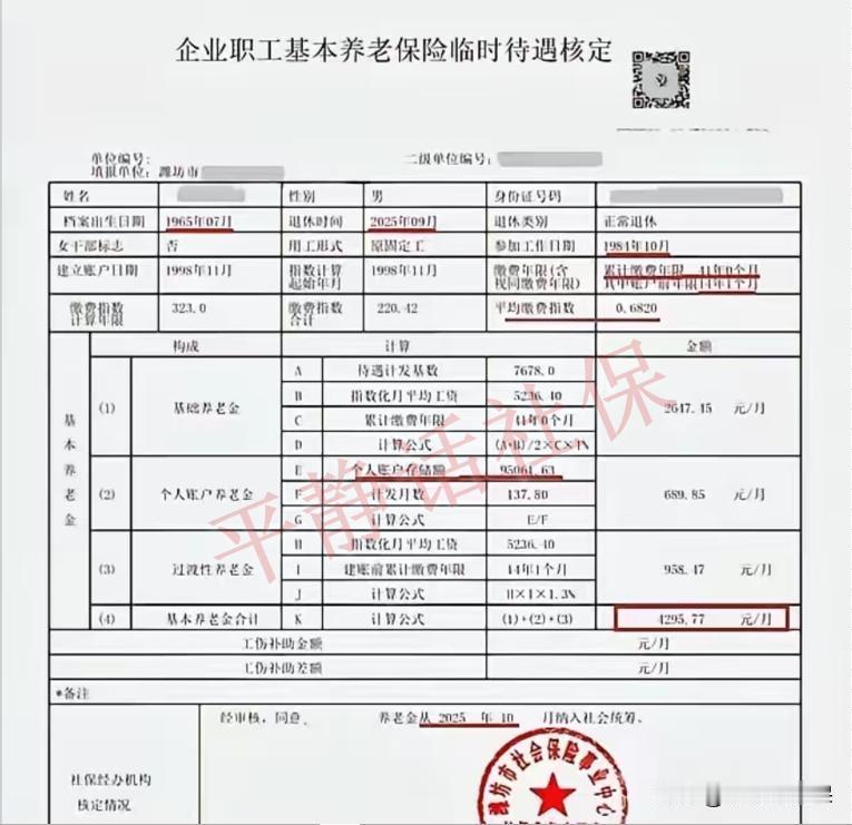 山东2025年计发基数已经公布,7831元,涨幅1.99%。 2025年退休人员重新核定、补发即将开始,到底能补多少,用实例来看。 男,25年9月退休,缴费41年,指数0.682,预核定额4295.77元。 重新按照7831元核定基础养老金和过渡性养老金。 基础养老金=7831*(1+0.682)/2*41*1%=2700.21 过渡性养老金=7831*0.682*14.08*1.3%=977.57元 共增加71.86元。 个账养老金不变。 简单算法: 基础养老金=原金额*1.99%=2647.45*1.99%=52.68 过渡性养老金=原金额*1.99%=958.47*1.99%=19.07 合计=71.75元 用(原核定额-个账养老金)*1.99%就是大致增加额。虽有误差,小到可以忽略。 快算算自己涨多少吧。