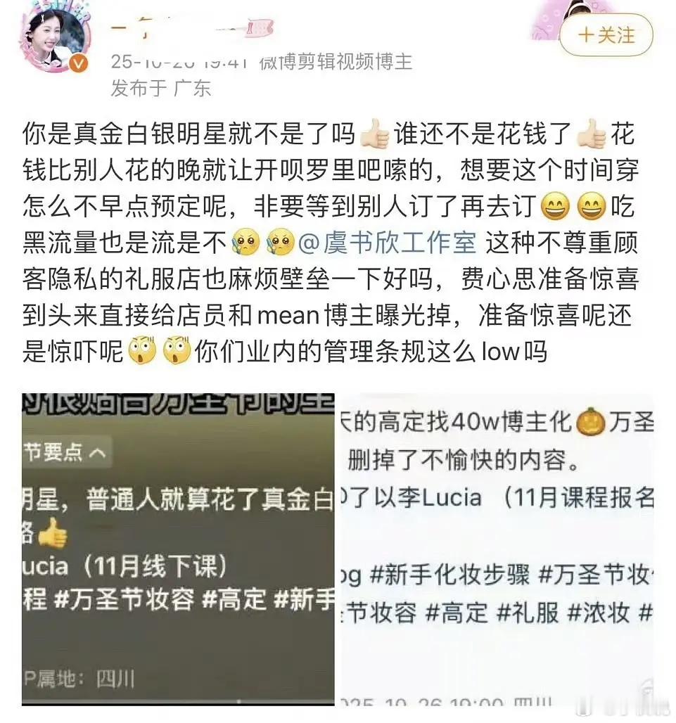 和🐟穿同一件礼服的博主被🐟丝麻辣了...😬起因是博主花了1w多租了套高定礼服发视频,结果粉丝发现🐟也租了这套衣服,骂博主为什么明知艺人要穿还不保密??有懂的说说,租礼服这种事需要保密且发图发视频必须晚于208之后吗???🐟自己公开活动一个不出来,粉丝还这么嚣张打压美妆博主,好霸道啊😱😱😱