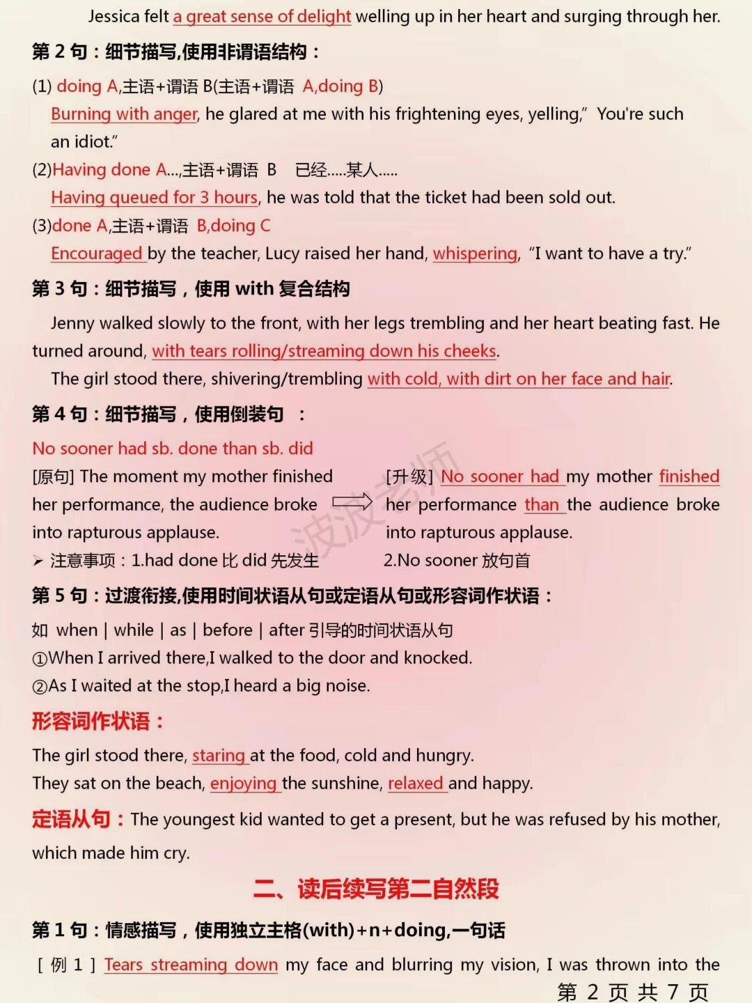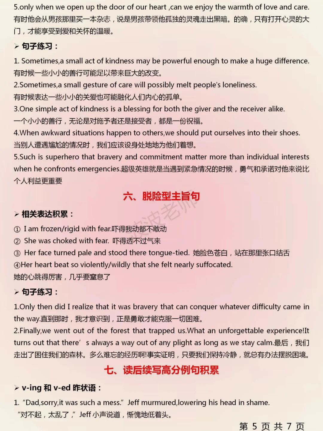 ⑥They embraced/nestled/cuddled each other fondly/affectionately with the balmy breeze blowing sb's hair and whipping sb's face/with the light air whispering in sb's ears/with the sun/sunlight/wind greeting us gently.他们深情拥抱着彼此/依偎在一起,微风吹动发丝,拂过脸颊/微风在耳边私语/阳光/微风轻轻地迎接我们。