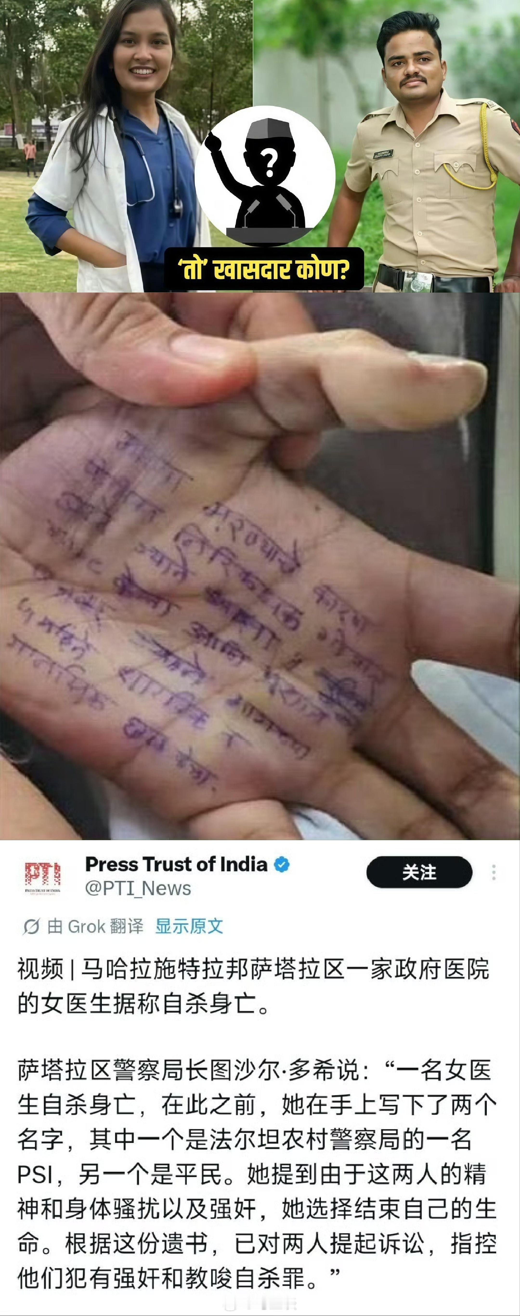 印度女医生遭警察多次性侵绝望自杀印度女子遭警察性侵手掌写遗书自杀热点观点