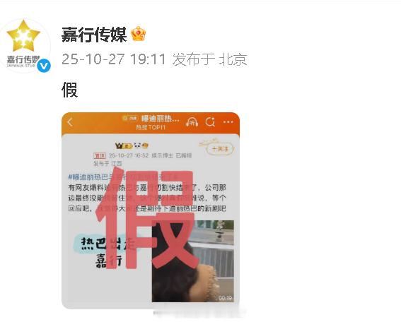 嘉行传媒辟谣和迪丽热巴切割快结束了嘉行传媒辟谣