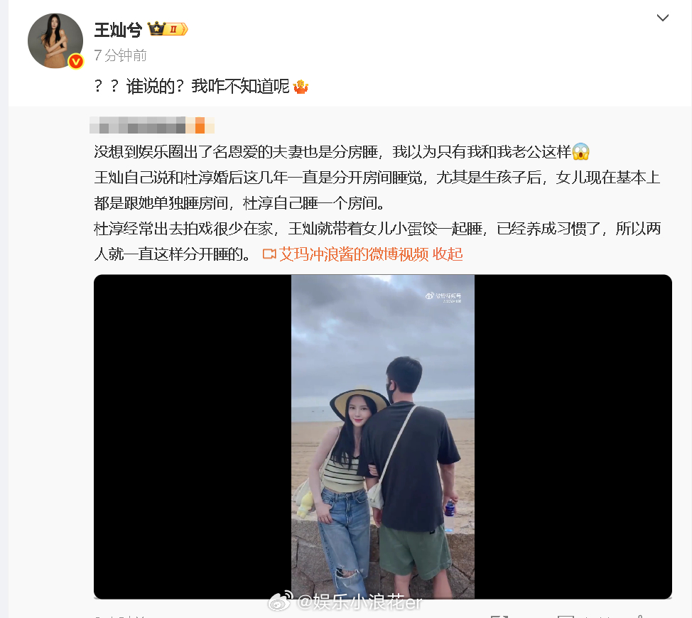 王灿否认与杜淳分房睡 近日,有网友曝和婚后一直分房睡觉。刚刚,转发并回应:“??谁说的?我咋不知道呢🤷”
