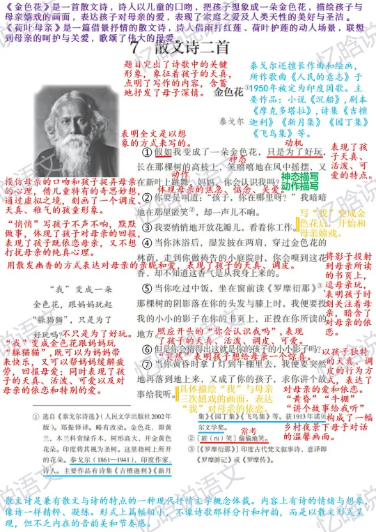 暑假过后开学就是初中生啦! 语文有没有预习呢,马上七年级的同学们快收藏呀! 我们要赢在第一步,从预习开始,掌握知识点,散文诗知识点很重要喔,考试必考内容,跟着老师的笔记学习一遍,开学上课的时候理解就更透彻啦~ 点赞收藏关注!不然找不到了~持续更新~ ---------------------------------[派对R] 七年级上册第七课《散文诗两首》