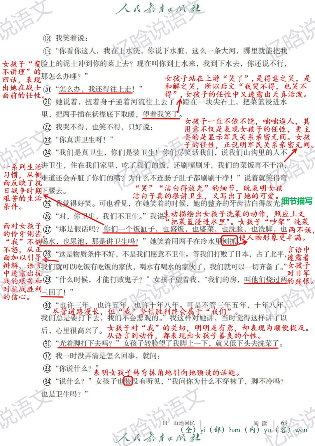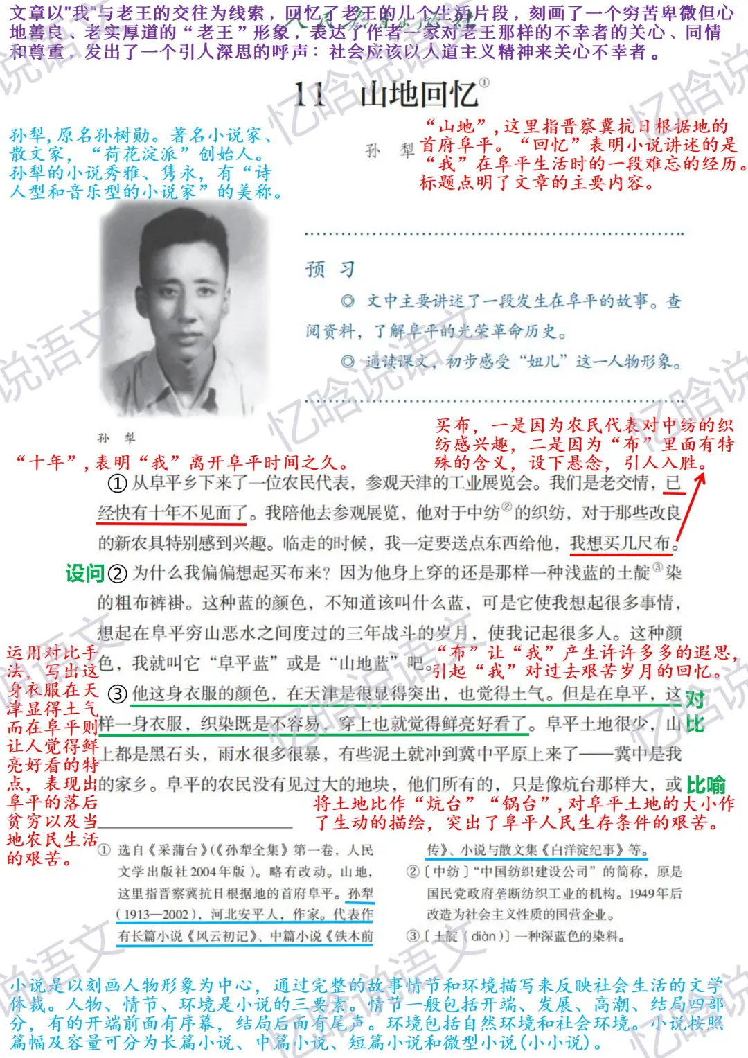 你今天预习了吗? 刷到这条就收藏吧,快点学习起来! 知识点很多,有不懂的积极问老师~ 点赞收藏关注我呀!不然找不到啦! ------------------------------- [飞吻R] 七年级下册第11课《山地回忆》