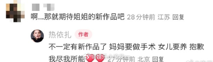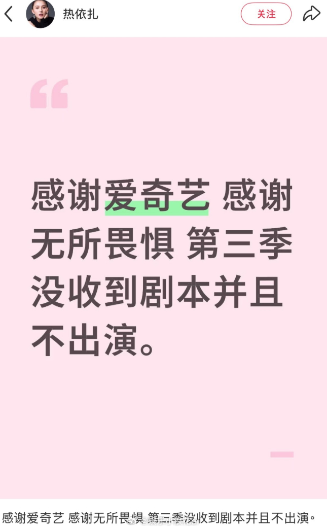 热依扎 不一定有新作品了热依扎称不出演无所畏惧第三季 热依扎发文:“感谢爱奇艺 感谢无所畏惧 第三季没收到剧本并且不出演。” 评论里热依扎还说:“不一定有新作品了。”啊??这是咋了?