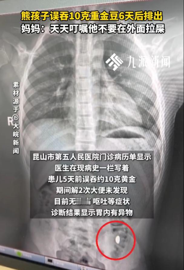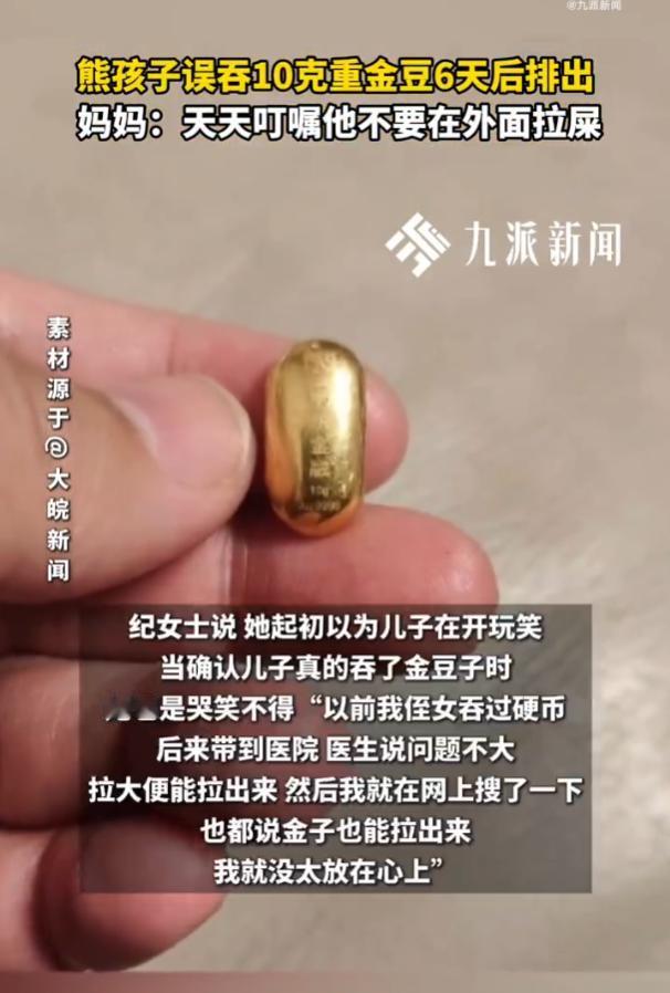 “误吞金豆”,10月27日,江苏昆山,孩子说要锻炼舌头,把纪女士刚买的10克金豆子吞下去了,等待了5天排2次大便均未发现,无奈送医检查,当事人:“拉出来了”。[得意] 一名11岁男孩在玩耍时,不慎将母亲新购买的一颗金豆吞入腹中,这颗金豆重约10克,价值近万元,孩子吞下后立即告诉了母亲,随后一家人经历了五天的等待与观察。 在随后的五天里,纪女士每天检查孩子的排便,但两次均未发现金豆的踪迹,由于物品价值较高,且担心影响孩子健康,10月26日,她带孩子前往昆山市第五人民医院就诊,门诊病历显示患儿误吞黄金约10克,期间已有两次排便,未见异物排出。 孩子并未出现腹痛、呕吐等不适症状,医生确认金豆位于胃内,而就在就诊当天下午,孩子顺利将金豆排出体外,从误吞到排出,前后共六天时间。 事后纪女士将这段经历分享到社交平台,不少家长表示孩子误吞异物的情况并不罕见,尤其是对学龄前和小学低年级儿童来说,好奇心强、辨识能力弱,容易发生此类意外。 误吞异物是儿童常见的意外伤害之一,医院每年接诊的儿童误吞异物案例中,以硬币、电池、玩具零件居多,贵金属如金豆,因表面光滑、密度大,若体积不大、边缘圆润,通常可自然排出。 但并非所有异物都能如此顺利,比如纽扣电池具有化学腐蚀性,磁铁可能导致肠粘连,尖锐物品易划伤消化道,这些情况都需要立即就医,不可延误观察。 家长在发现孩子误吞异物后,首先应保持冷静,确认异物种类与大小,若为圆滑小物,可先观察孩子状态;若为危险物品,则应立即送医,期间需密切留意是否出现腹痛、拒食、呕吐或便血等症状。 妥善收纳家中小件物品十分关键,金银饰品、珠宝、纪念币等贵重物品,应存放在儿童无法轻易打开的带锁收纳盒中,并置于高处,日常也要教育孩子,明确哪些东西不能放入口中。 看了昆山这位妈妈分享的“万元金豆历险记”,大家伙儿在心疼妈妈的同时,也被这孩子的“硬核操作”弄得哭笑不得。 “我家娃三岁的时候吞过一枚一元硬币,我那几天也是拿着筷子在屎里扒拉,跟考古似的,最后找到的时候差点喜极而泣。” “没在屎里淘过金的父母,不足以谈人生”。 “好家伙,这真是名副其实的‘屎里淘金’!”。 “这孩子排出来的不是屎,是移动的万元户啊。” “等五天?这要是我,一天不拉我都得着急,这相当于每天贬值两千块啊!” “这妈妈做得对,没有盲目用土办法,及时去医院检查,这才是最稳妥的。” “其实这种小而光滑、没有棱角的异物,如果孩子没有不适感,大概率能自己排出来,但一定要拍片确认位置,家长不能心大。” “如果是吞了电池怎么办?卡住了有什么症状?” 你们家有没有一个让你时刻提心吊胆的“熊孩子”?TA做过最让你后怕的一件事是什么?快来评论区分享你的故事,给其他爸妈们都提个醒! 信源:九派新闻