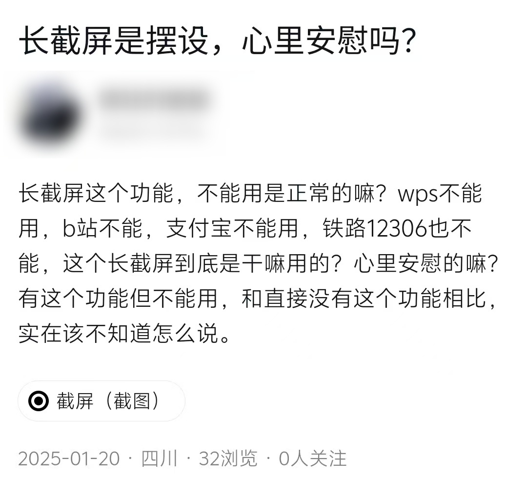 修复各种以往不支持截长屏场景,比如 Edge浏览器、支付宝、淘宝购物车、小红书、WPS、微博,12306,还有DeepSeek等。