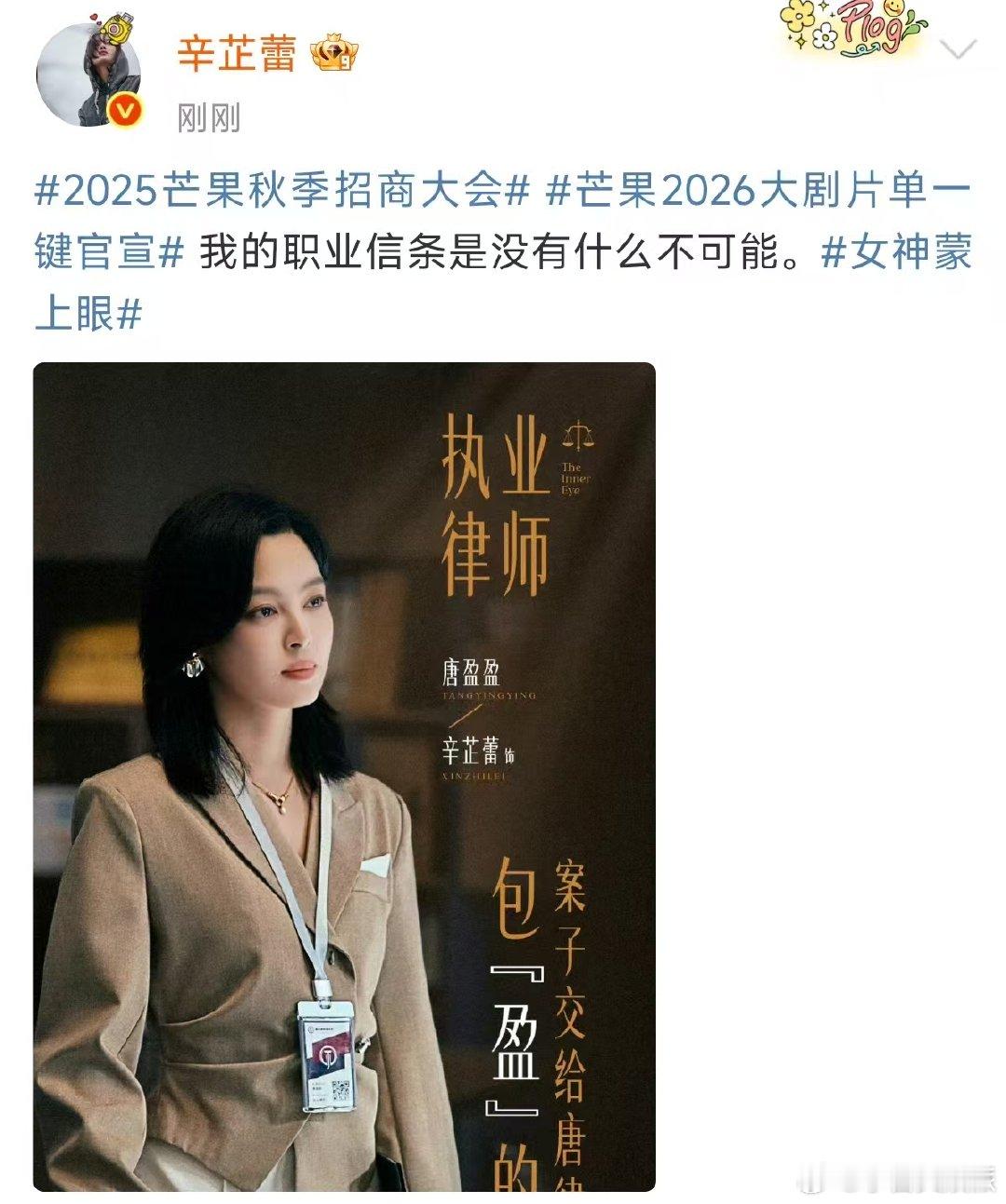 辛芷蕾首演律师角色辛芷蕾首演律师辛芷蕾首演律师唐盈盈,《女神蒙上眼》海报干练造型+“案子交给唐律师包盈”的宣言,尽显律政精英范儿,芒果新剧这波期待值拉满!芒果2026大剧片单一键官宣