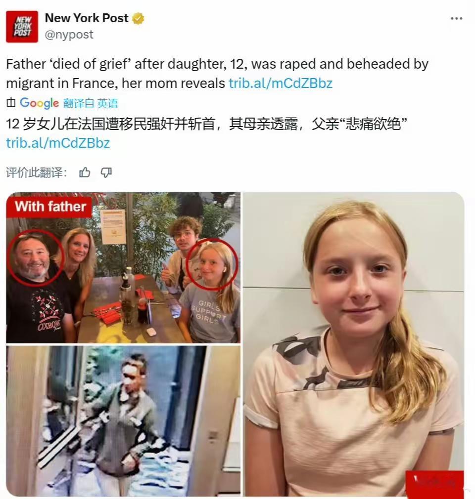 纽约邮报:12岁女儿在法国遭移民强奸并斩首,其母亲透露,父亲“悲痛欲绝”。